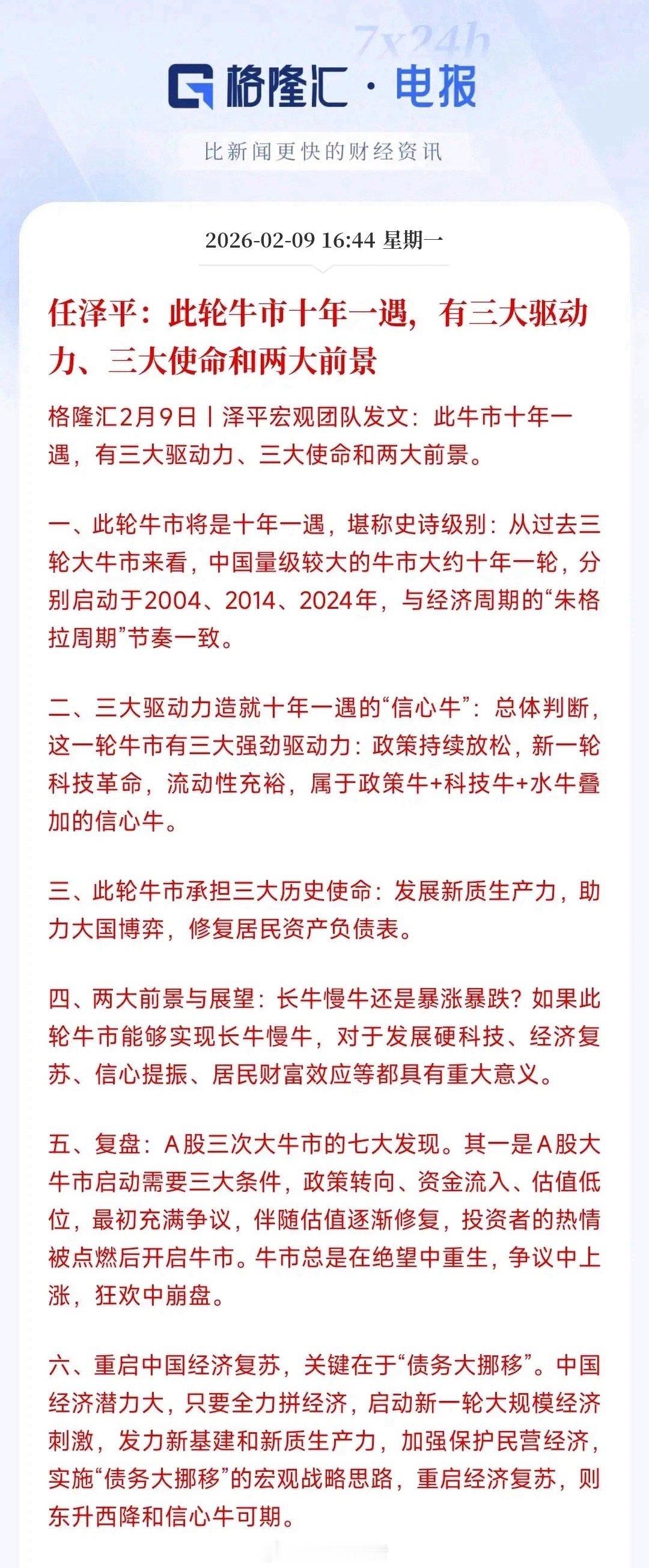 任泽平近期谈及市场观点,认为当前这轮牛市堪称十年一遇,并指出背后有三大支撑因素:一是政策持续宽松,二是科技股引领的产业革命,三是流动性的持续支持。