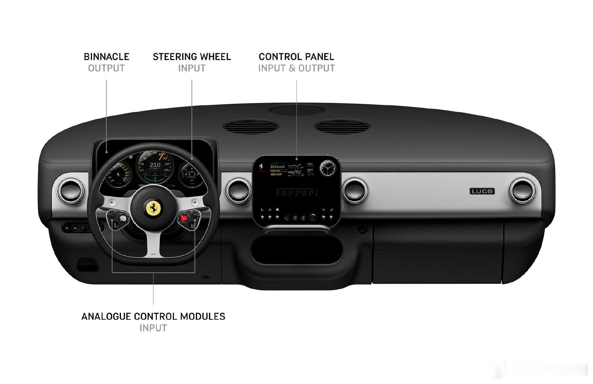 法拉利Luce充分体现了不用大屏,汽车还有太多体现设计风格的办法。方向盘由 19