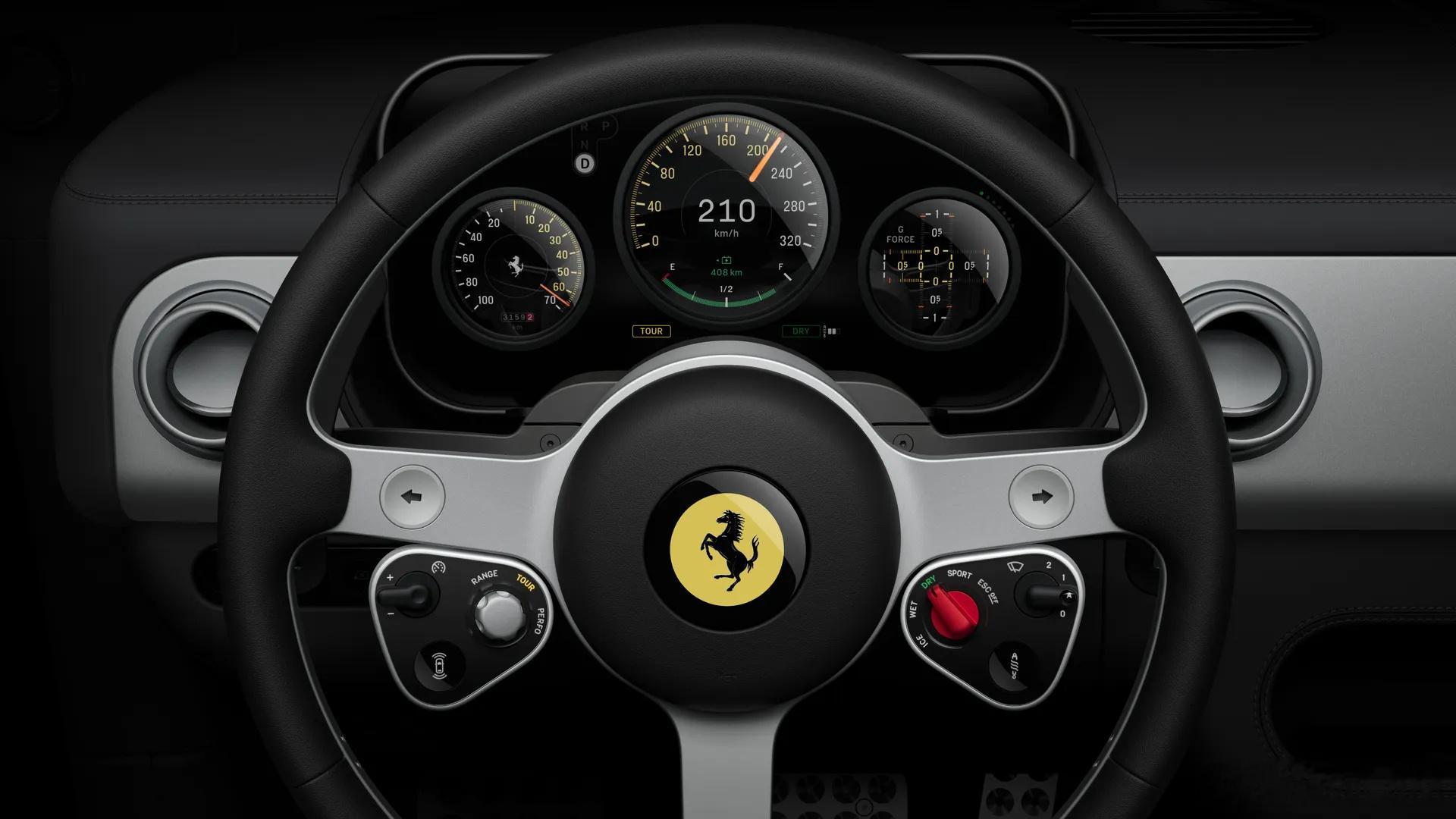法拉利Luce充分体现了不用大屏,汽车还有太多体现设计风格的办法。方向盘由 19 块实心铝经 CNC 数控铣削制成,隐藏结构也做阳极氧化处理,相较标准款方向盘轻 400g;该材质还应用于仪表盘框架、物理指针、按键等所有金属部件。
