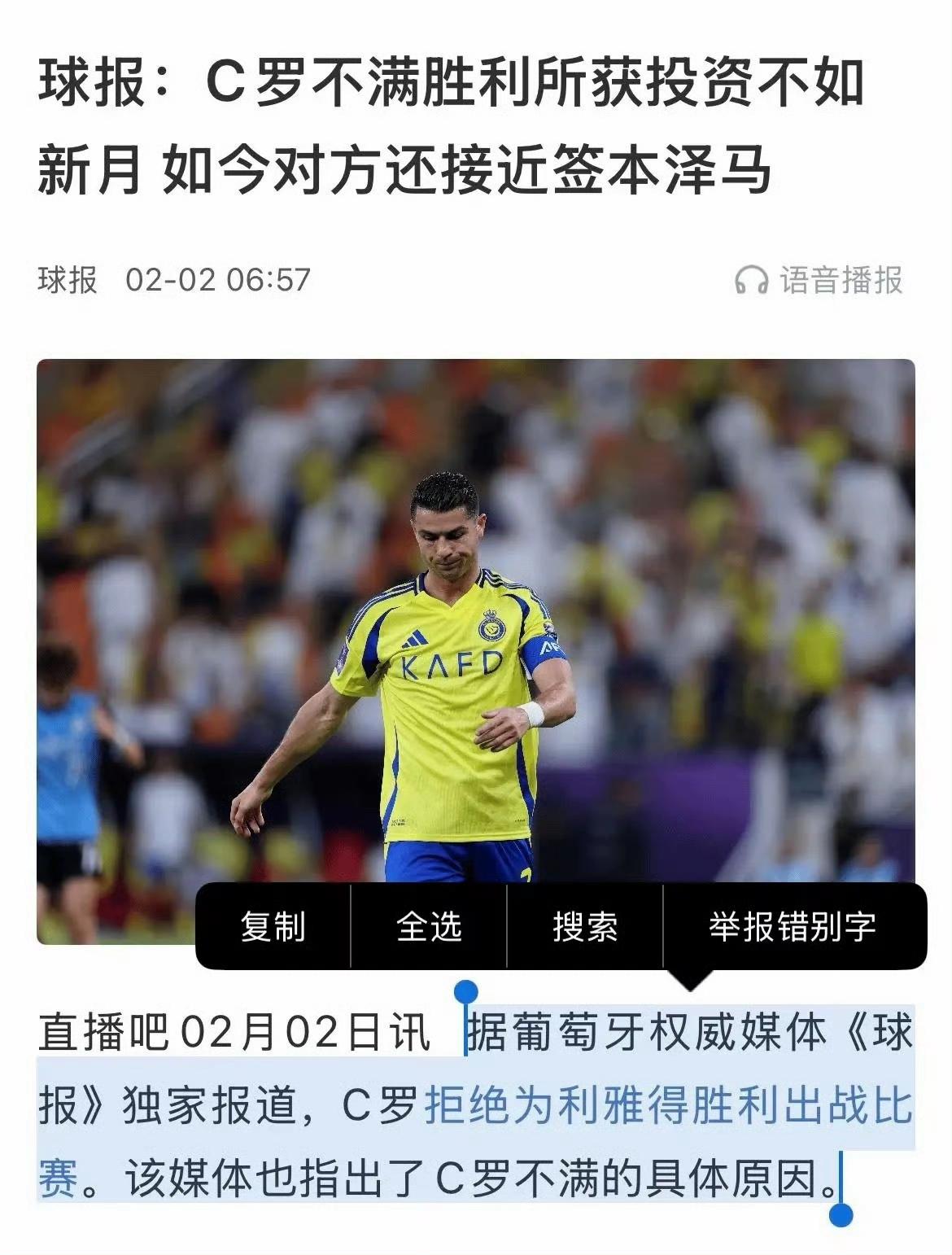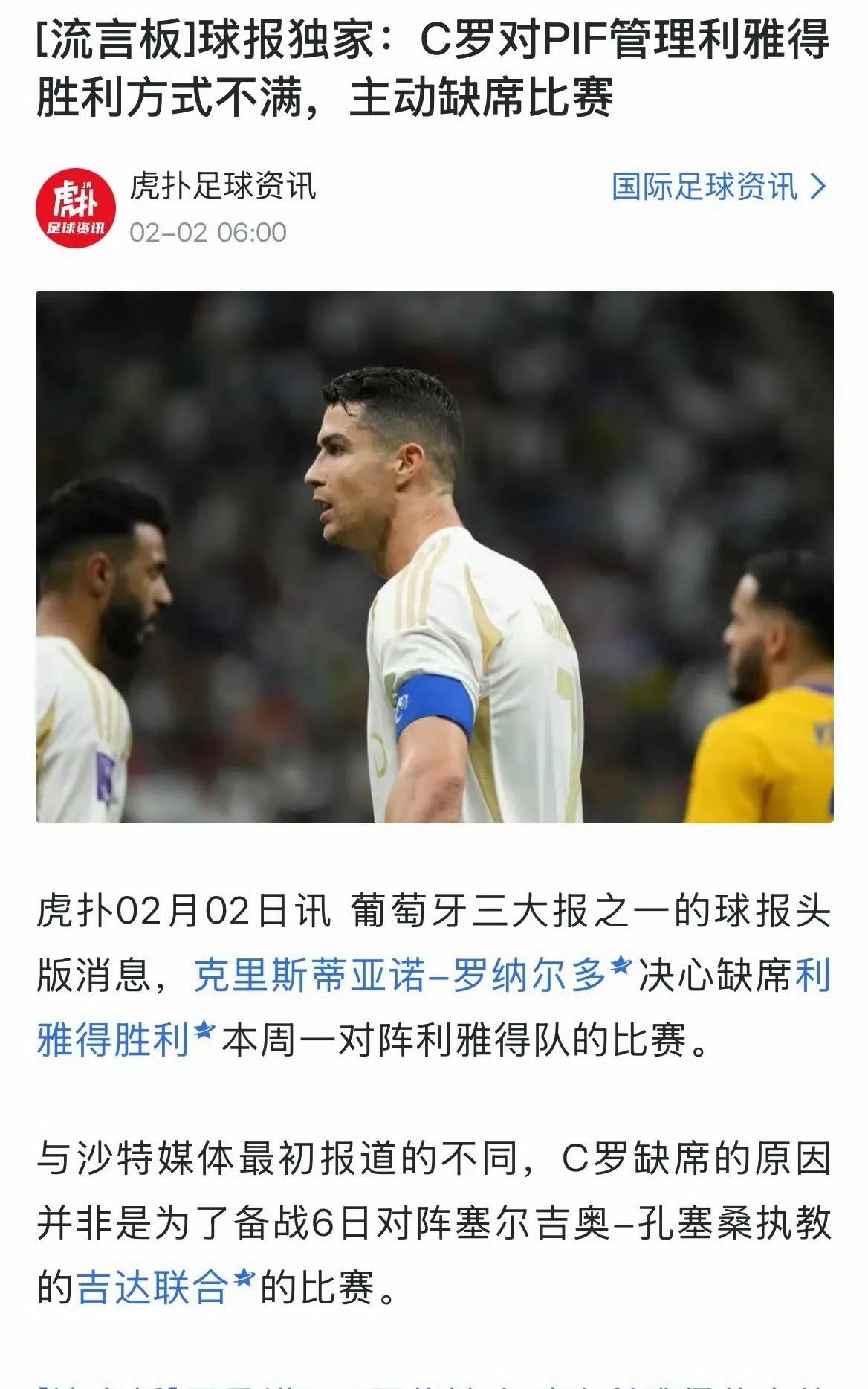 C罗战胜沙特土豪重返赛场!聪明的C罗:“借别人的苦,装自己的义。” 利雅得胜利管理层结清了所有拖欠员工的款项,塞梅多和西芒也已重新获得去年12月底被剥夺的权力。 罢赛第一天:“不满本泽马加盟、资源倾斜、引援不公”。 罢赛第五天,舆论发酵、被批评耍大牌、输不起且利雅得胜利一直赢:“改口为基层员工讨薪”。
