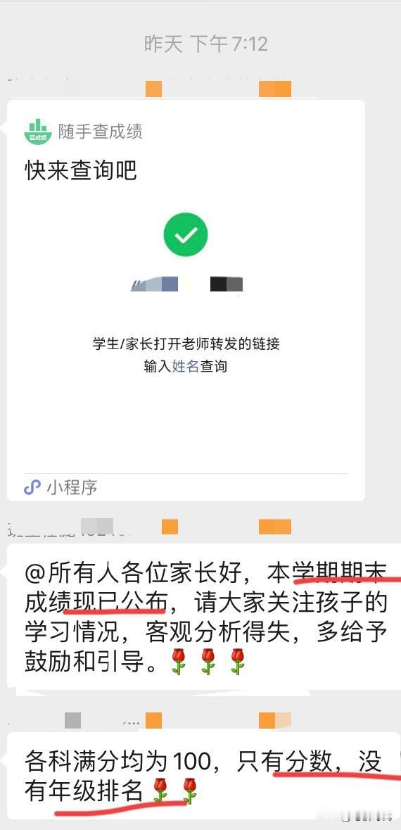 不得不吐槽!昨天休业式结束,初中生期末成绩只有等级,家长忍不住问班主任分数。班主任一句话直接点燃了家长的怒火! 昨天休业式结束后,班主任就在群里发了期末成绩查询的小程序,打开后直接懵了! 家长发现满是ABCD等级,甚至有的不知道这个等级代表什么,一个劲地问,有的急忙联系老师问分数。有家长还问我什么意思。 哪知班主任在群里发话轻飘飘地应对,艾特所有人,期末考试没有分数,没有排名,只有等级。这引起家长不满。 期末考试没有分数?这能说得过去吗?没有分数,等级从何而来?现在的家长有这么好糊弄? 到了晚上,班主任还是受不了众多的家长质问,只好再次发布期末成绩查询的小程序,这次各自家长都查到了自己孩子的分数,这才平息家长怒火。 说起来现在的学校教育很搞笑,平时周周考、月月考,分数班排名校排名齐上阵。甚至退步进步几名都统计清清楚楚。 你说这期末成绩却来一个等级模糊糊弄,家长哪能接受啊! 我认为,不管是老师还是家长应该教育学生坦然面对自己分数,没必要遮遮掩掩,更不能掩耳盗铃。