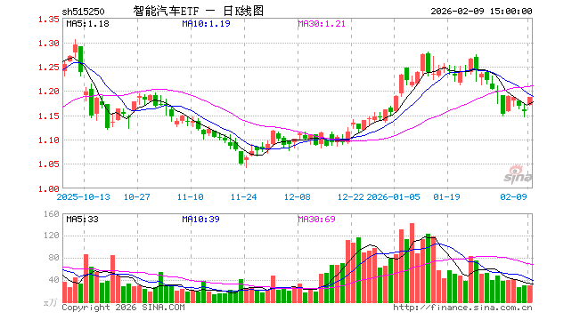 2月9日,智能汽车ETF(515250)涨2.42%,成交额3595.89万元。当日份额增加400.00万份,最新份额为6.14亿份,近20个交易日份额减少1.35亿份。最新资产净值计算值为7.27亿元。