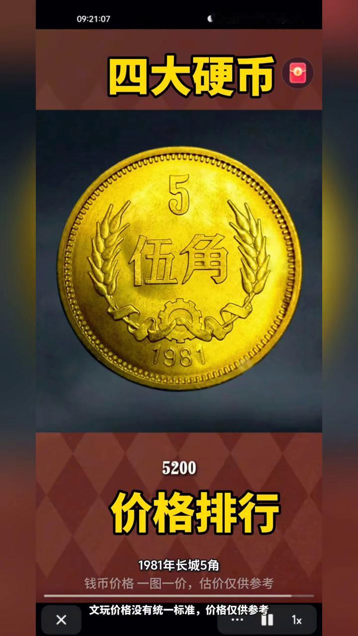 四大硬币价格排行。 我国四大硬币排名,看看你家有几枚? ·第一名:2000年牡丹1元,参考价21000元。 ·第二名:1985年长城2角,参考价19000元。 ·第三名:1999年梅花5角,参考价12000元。 ·第四名:1981年长城5角,参考价6300元。 你家能找到几枚说不定就咸鱼翻身了。