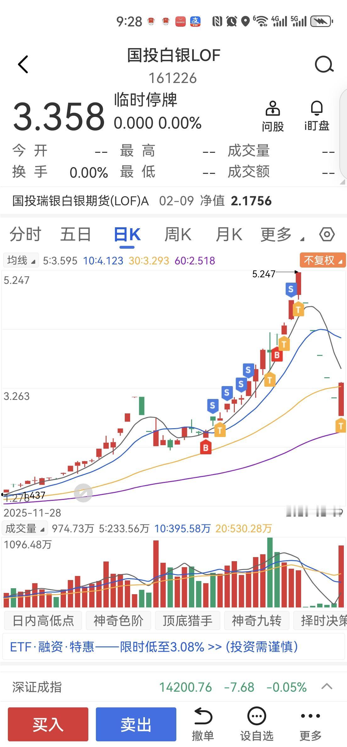 国投白银LOF高溢价停牌一个小时,补跌风险已至,切勿追高—— 家人们,今天的白银市场,有一个品种的风险已经到了不得不警惕的地步——国投白银LOF(161226)。 从基本面看,截至2月9日,该基金净值仅为2.1756元,而二级市场价格却被炒到3.358元,溢价率超过50%。这意味着,你在二级市场买入的每一份基金,其实际价值只有你付出价格的三分之二。这种严重的价格背离,完全是市场情绪的过度炒作,缺乏任何基本面支撑。 而国际白银市场的走势,更是雪上加霜。伦敦银现与纽约银均出现小幅下跌,沪银期货也低开低走,这直接压制了基金净值的表现。在这种背景下,高溢价的泡沫被戳破,只是时间问题。 再看技术面,风险信号已经非常明确: 1. 均线系统破位:日K线图上,股价在高位连续收出大阴线,已有效跌破5日、10日等短期均线,且短期均线拐头向下形成死叉,同时也跌破了30日中期均线,这标志着短期和中期趋势均已由强转弱,空头力量开始主导。 2. 量价关系异常:在股价高位回落的过程中,成交量明显放大,形成“放量下跌”的形态。这说明在高位有大量资金恐慌性出逃,抛压沉重,并非健康的回调,预示着后续仍有较大的下行空间。 3. 高位见顶信号:股价在创出5.247元的历史新高后迅速回落,形成典型的见顶K线形态,随后的连续大阴线彻底确认了顶部结构,反弹乏力,下跌趋势已经确立。 基本面的高溢价泡沫,叠加技术面的破位下跌,形成了强烈的共振。今日的临时停牌,正是市场机制对这种非理性状态的修正信号。一旦复牌,价格向净值回归的动力极强,补跌风险极高,甚至可能出现连续跌停的情况。 对于投资者而言,当前阶段应保持绝对理性,切勿在高溢价下追高。对于已持仓者,应密切关注溢价率变化,及时控制风险,切勿抱有抄底幻想。 ⚠️ 免责声明:本文仅为作者个人非专业的市场分析与风险提示,不构成任何投资建议。本人并非专业投资顾问,所有观点均基于公开信息与个人观察。投资决策需基于您个人的风险承受能力与独立判断,市场有风险,入市需谨慎。据此操作,盈亏自负。