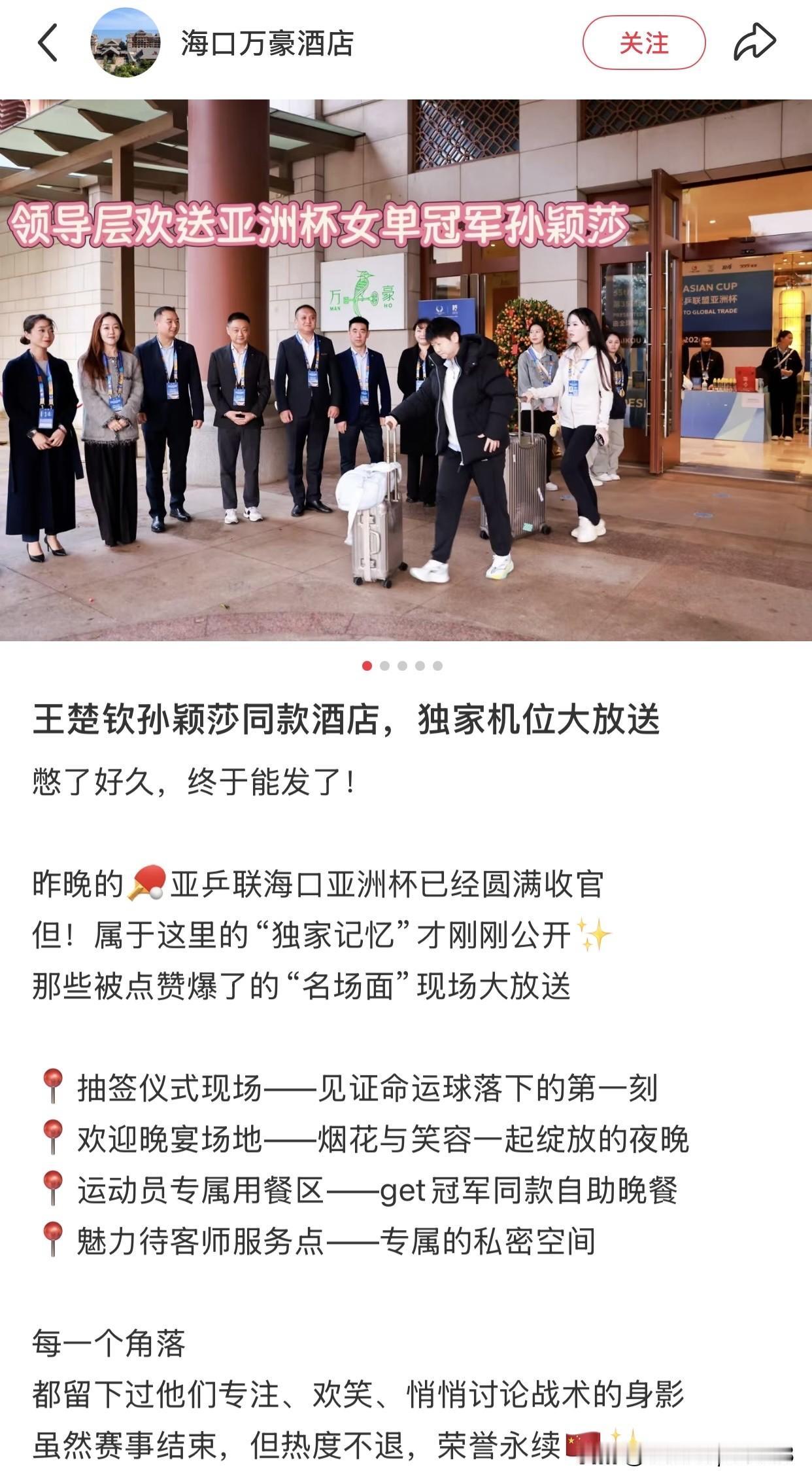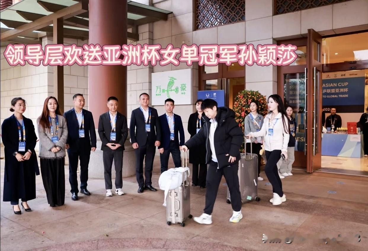 亚洲杯结束,原来是领导层一早站在门口欢送孙颖莎退场。 8号晚上结束了所有的比赛,孙颖莎和王楚钦夺得亚洲杯男女单冠军, 王曼昱,蒯曼获得女单亚军和季军。 9号一早大家在酒店出发,准备回北京。 一早,领导们站在门口欢送大家,这场比赛无论是给海南,还是给主办方,赞助方, 以及接待来自四面八方球迷观众的各个场所, 都带来了巨大的收益。 对比没有孙颖莎王楚钦比赛的场地,亚洲杯的盛况就是孙颖莎,王楚钦影响力的再次展现!