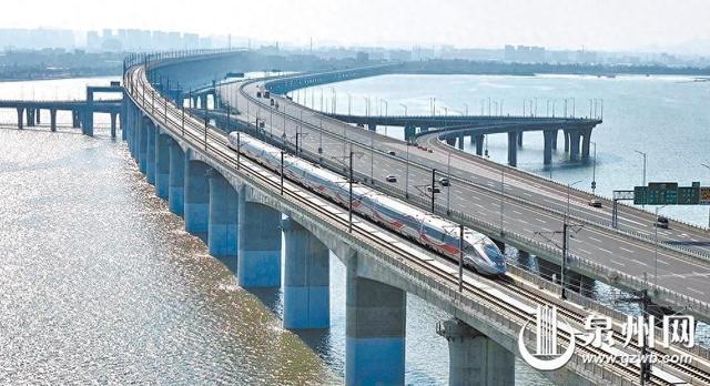 在泉州湾跨海大桥,高铁列车和汽车并行,网友感叹“好可爱的春运图景”。