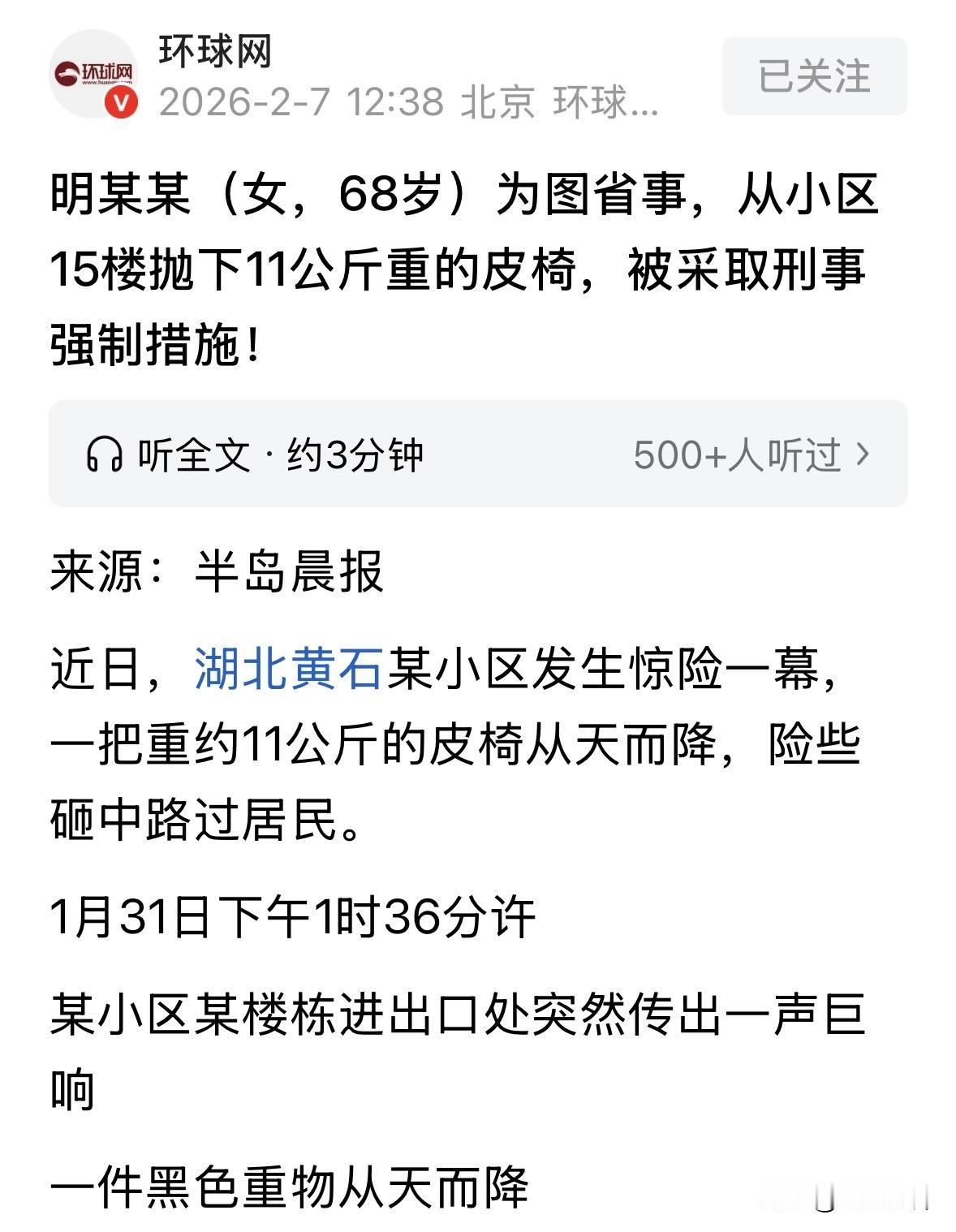 “坏人变老了!”湖北黄石,68岁大妈懒得下楼一趟,就把一个重达11公斤的皮椅,从15楼扔了下去,一名老人带着孩子恰好经过,离皮椅砸下来的地方不到3米,一老一小差点一命呜呼。警方找上门时,大妈还不以为意,觉得自己又没真的砸死人。结局解气了。 1月31日下午1点36分,湖北黄石某小区。午后的静谧被一声类似于“投弹”的沉闷巨响撕裂。这不是鞭炮,也不是哪家装修走火,而是地面实打实的震动与腾起的灰尘。 在烟尘中心不到3米处,一位老人紧紧攥着4岁孙子的手,整个人僵在原地。如果他们的步幅再大一点,或者刚才没有因为琐事停顿那一秒,两个家庭的命运将在这一刻彻底坍塌。 这一“天降杀机”并非陨石,而是一具摔得四分五裂的黑色皮椅骨架。民警赶到现场,看着满地狼藉后背一阵发凉,现场称重显示:11公斤,整整22斤。 这不是意外坠物,这是一场精准计算后的“抛售”。警方沿着抛物线轨迹回溯,借助监控展开细致的逐层排查。凭借高效的侦查手段,迅速将目标锁定为住户明某某。这位68岁的大妈住在14楼,却把这一幕惊悚剧的发射台选在了15楼。 复盘一下这位“废品精算师”的操作,你会感到后背发凉。案发前一日,她将这把废弃皮椅拾回,囤于15楼消防通道。这看似平常之举,实则是一场精心谋划、宛如“资产剥离”般精准的操作。 她利索地拆走了所有能换钱的金属扶手和铁腿——这是她的“利润”。剩下的11公斤皮质骨架,对她而言就是单纯的“负资产”,一文不值且占地方。 此时她面临一道算术题:走几十级台阶或等电梯搬运这堆垃圾下楼,意味着高昂的体力成本。而推开走廊尽头的窗户扔下去,体力成本几乎为零。 为图些许省力之便,她竟将楼下行人的性命当作筹码。如此行径,着实令人心寒,把侥幸当常理,漠视他人安危至此!她事后所谓的“向下看了一眼确认无人”,是这场疯狂赌局中唯一的、也是完全不可靠的风控措施。 当警察登门时,明某某流露出的“精明”与“不屑”,实则源自一种古老的“结果论”思维定式。这种思维,在其面对警察时,尽显无遗。面对监控铁证,她虽然承认了,但理直气壮地反问:“我又没真的砸到人,至于吗?” 于她的认知而言,此事至多算是不文明之举,尚处于道德的范畴之内。若未见血光、未酿人命,便等同于“未惹祸端”,至多不过遭受些许批评罢了。 但她不知道的是,现代刑法早已筑起了一道名为“行为犯”的铁壁。自2021年“高空抛物罪”入刑,高空抛物判罚不再依赖运气。法律如高悬利剑,以明晰条文和威严惩处,为公众筑牢安全屏障,让肆意妄为者无处藏匿。 不论是否砸中他人,只要自高楼抛掷足以造成人员伤亡的重物,此等危害公共安全之举,已然触及法律红线,其行为本身即已构成犯罪。 数据不会撒谎。一个鸡蛋从25楼落下都能致人死亡,更何况是11公斤带有金属残留的骨架?这绝非单纯的抛物之举,其本质而言,恰似于人群头顶高悬利刃。此等行径,如达摩克利斯之剑,时刻威胁着众人的安全。 当侥幸心理撞上刑法铁壁,她省下的那点“下楼力气”,最终转化为了沉重的“牢狱代价”。当下,明某某因涉嫌违法事宜,已被执法部门依法予以刑事拘留。执法部门后续将严格遵循法定程序,妥善处理该案件,以维护法律的公正与权威。 那一推,摒弃的岂止是垃圾,更是对晚年自由的轻掷。这看似不经意的举动,实则如蝴蝶振翅,悄然改变了此后自由闲适的暮年轨迹。当自觉无法守住文明底线时,法律的铁窗将成为最后的强制防线。 信息来源: 环球网
