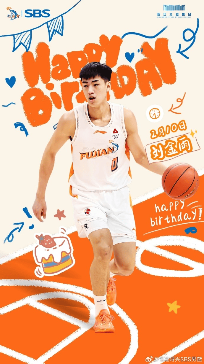 配文:今天是刘金雨的生日,让我们一起祝福他生日快乐!2022年6月刘金雨入选U18国青男篮,出征亚洲U18男篮锦标赛,在4场小组比赛中,他场均能够砍下16.3分3.8篮板2助攻0.8抢断0.3封盖,得分领跑全队。2023-2024赛季,刘金雨升至广州龙狮男篮一队。在代表广州龙狮男篮征战CBA联赛首个赛季之后,2024-2025赛季刘金雨正式加盟福建SBS浔兴篮球俱乐部。作为主队主要轮换球员,上赛季刘金雨共代表主队出战CBA联赛41场比赛,场均上场20.2分钟,可以得到5.6分1.9篮板1.1助攻。2025年6月9日,中国篮协公布了新一期国家男篮集训名单,刘金雨成功入选。本赛季截止第一阶段,刘金雨共代表主队出战CBA联赛19场,场均9.3分钟,可以得到2.9分。