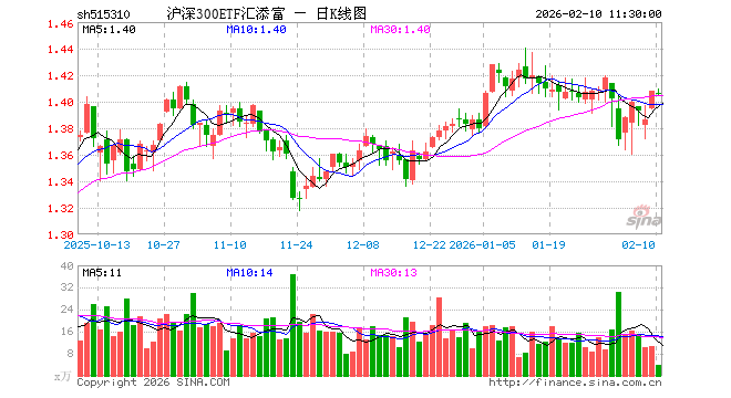 2月10日,截止午间收盘,沪深300ETF汇添富(515310)跌0.14%,报1.406元,成交额539.33万元。沪深300ETF汇添富(515310)重仓股方面,宁德时代截止午盘跌0.76%,贵州茅台跌0.89%,中国平安跌0.90%,中际旭创跌0.48%,紫金矿业涨0.28%,招商银行跌0.23%,新易盛涨0.99%,美的集团涨1.00%,兴业银行跌0.21%,长江电力涨0.26%。