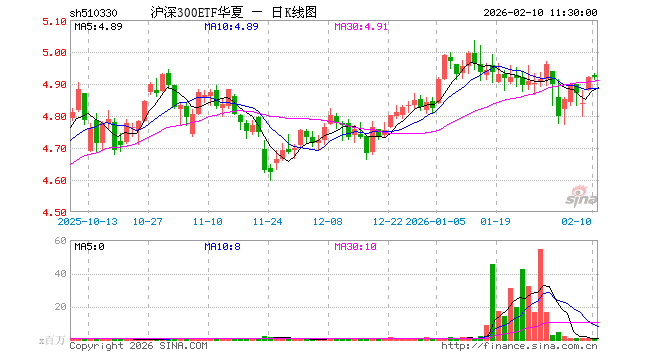 2月10日,截止午间收盘,沪深300ETF华夏(510330)涨0.00%,报4.921元,成交额7742.03万元。沪深300ETF华夏(510330)重仓股方面,宁德时代截止午盘跌0.76%,贵州茅台跌0.89%,中国平安跌0.90%,中际旭创跌0.48%,紫金矿业涨0.28%,招商银行跌0.23%,新易盛涨0.99%,美的集团涨1.00%,兴业银行跌0.21%,长江电力涨0.26%。