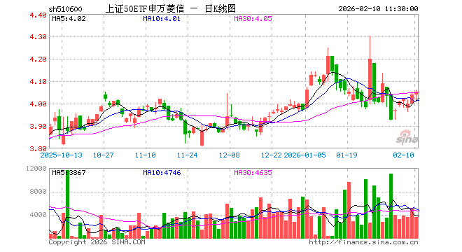 2月10日,截止午间收盘,上证50ETF申万菱信(510600)涨0.27%,报4.050元,成交额145.27万元。上证50ETF申万菱信(510600)重仓股方面,贵州茅台截止午盘跌0.89%,中国平安跌0.90%,紫金矿业涨0.28%,招商银行跌0.23%,兴业银行跌0.21%,长江电力涨0.26%,寒武纪涨1.21%,中信证券涨0.14%,恒瑞医药涨1.95%,工商银行涨0.41%。