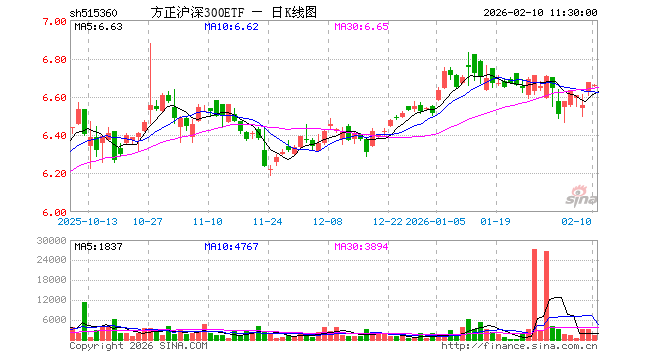 2月10日,截止午间收盘,方正沪深300ETF(515360)跌0.24%,报6.657元,成交额92.58万元。方正沪深300ETF(515360)重仓股方面,宁德时代截止午盘跌0.76%,贵州茅台跌0.89%,中国平安跌0.90%,中际旭创跌0.48%,紫金矿业涨0.28%,招商银行跌0.23%,新易盛涨0.99%,美的集团涨1.00%,兴业银行跌0.21%,长江电力涨0.26%。