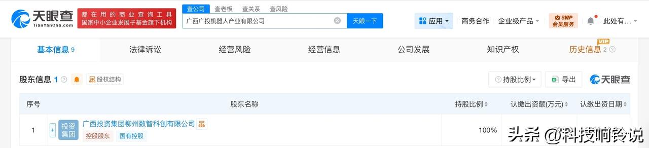 【广西投资集团成立机器人产业公司 注册资本5亿】 天眼查工商信息显示,近日,广西广投机器人产业有限公司成立,法定代表人为陈琛,注册资本5亿人民币,经营范围含工业机器人制造、工业机器人销售、特殊作业机器人制造、智能机器人销售、供应链管理服务、软件开发、人工智能应用软件开发、人工智能基础软件开发、人工智能公共数据平台、卫星通信服务等。股东信息显示,该公司由广西投资集团柳州数智科创有限公司全资持股。 天眼查信息: