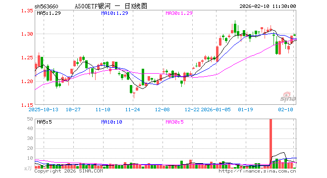 2月10日,截止午间收盘,A500ETF银河(563660)涨0.00%,报1.295元,成交额60.15万元。A500ETF银河(563660)重仓股方面,宁德时代截止午盘跌0.76%,贵州茅台跌0.89%,中国平安跌0.90%,中际旭创跌0.48%,紫金矿业涨0.28%,招商银行跌0.23%,新易盛涨0.99%,美的集团涨1.00%,兴业银行跌0.21%,长江电力涨0.26%。