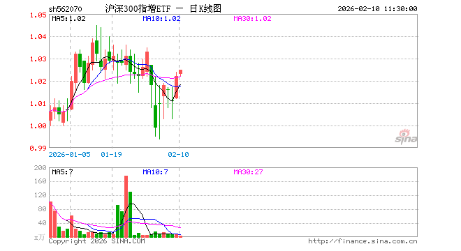 2月10日,截止午间收盘,沪深300指增ETF(562070)涨0.29%,报1.025元,成交额246.11万元。沪深300指增ETF(562070)重仓股方面,宁德时代截止午盘跌0.76%,贵州茅台跌0.89%,中国平安跌0.90%,紫金矿业涨0.28%,招商银行跌0.23%,兴业银行跌0.21%,中际旭创跌0.48%,新易盛涨0.99%,寒武纪涨1.21%,药明康德涨3.27%。