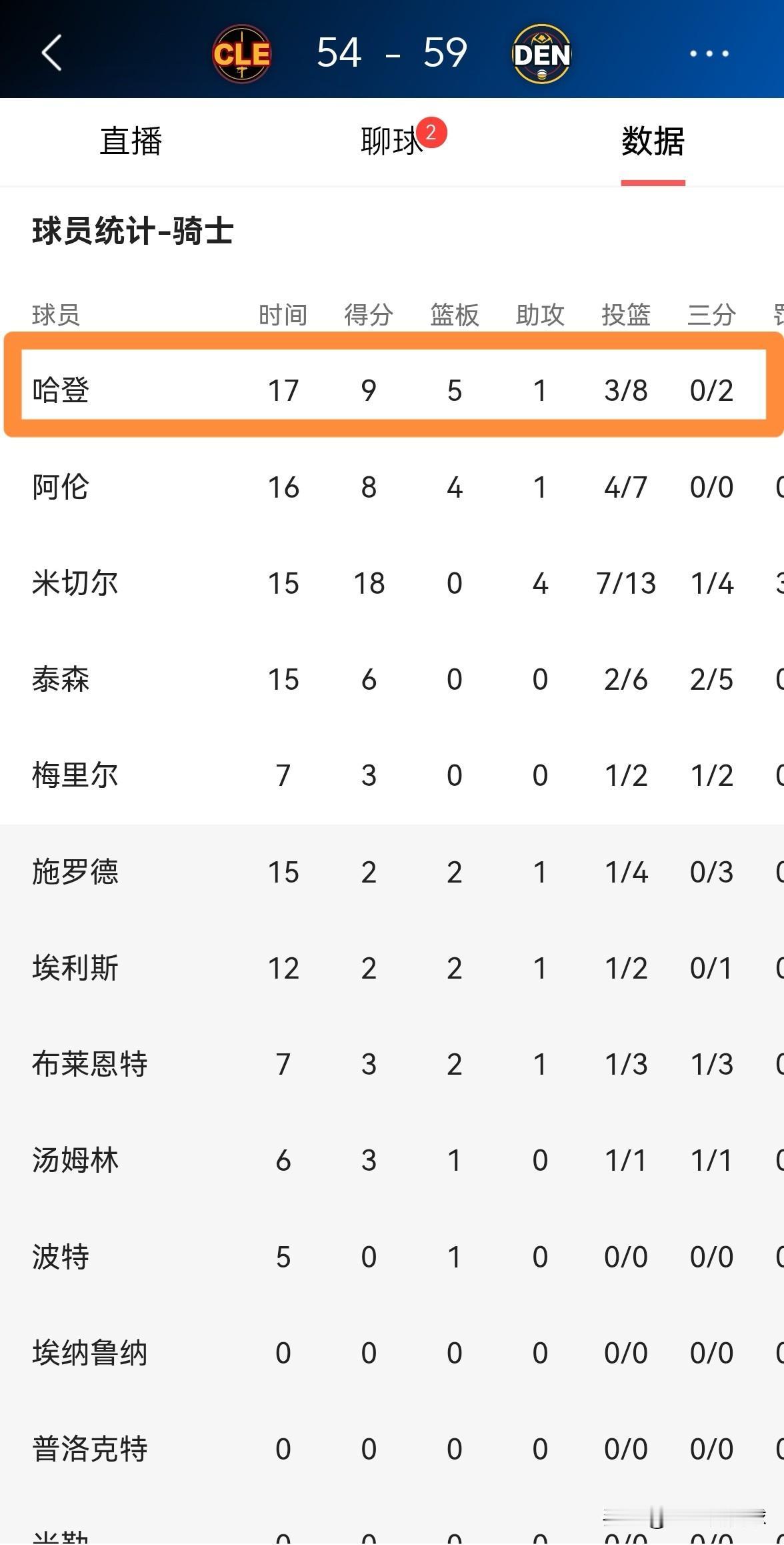骑士老将哈登真是太拼了!在今天骑士客场挑战掘金的比赛中,目前双方半场战罢,骑士以54:59落后于对手。在前两节比赛中,虽然哈登的进攻效率不高,但是他在攻防两端都拼尽全力,尤其是送出了2记封盖,展现出了非常强的拼搏精神。 在上半场比赛中,哈登首发出战17分钟,投篮8中3,其中三分球2中0、罚球3中3得到9分5篮板1助攻,外加2盖帽,仅仅出现了1次失误。