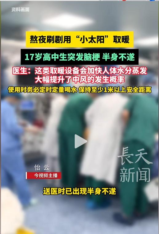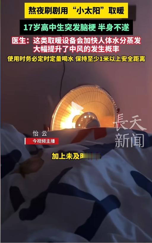 “这也太吓人了!”近日,福建,一17岁男高中生在家熬夜追剧时,为了暖和点就将小太阳放在了身边,烤了几个小时后开始感觉头疼,看不清东西。被家长紧急送医后,医生的诊断竟然是急性枕叶脑梗。网友:小太阳这么危险的么? 漫漫寒冬,很多人喜欢用小太阳,电暖风等取暖,尤其是孩子们,恨不得把自己贴在上面,殊不知这里面有很大的安全隐患。 据媒体1月29日报道,这名高中生在家里熬夜追剧时觉得有点冷,就把小太阳放到了身边,想着自己更舒服些。刚开始只是觉得自己眼睛有些干,就没放在心上。可是烤了一会后,他觉得自己的头就跟要炸了的疼,眼睛也开始看不清东西,家长这才把他紧急送去了医院。 到了医院,医生诊断结果出来后,才知道竟然是急性枕叶脑梗。这是身体失水过多导致的。人们在使用小太阳时,会加剧身上水分的蒸发,如果不能及时补充水分,就可能诱发这种急性枕叶脑梗。治疗不及时就会导致永久性视觉损伤,严重的甚至会危及生命。 网友看后表示,我单知道小太阳可能会引发火灾,没想到使用不当对人的伤害也这么大,以后用的时候要多多注意了。 在使用小太阳等取暖工具时,一定要注意多喝水,多通风,同时避免距离过近、直吹等使用方式。 信息来源:《熬夜刷剧用“小太阳”取暖,17岁高中生突发脑梗半身不遂,医生:这类取暖设备会加快人体水分蒸发,大幅提升了中风的发生概率,使用时务必定时定量和胡思,保持至少1米以上安全距离》今视频长天新闻