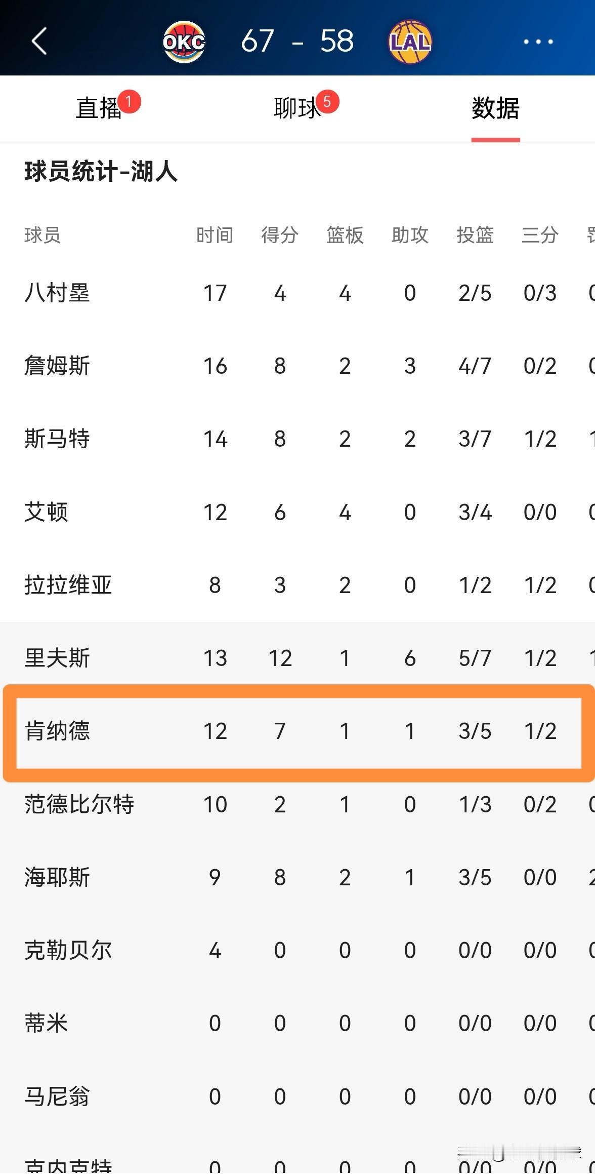 湖人新援肯纳德真是太亮眼了!在今天湖人主场迎战雷霆的焦点战中,目前双方的上半场比赛已经结束,虽然湖人以58:67落后于对手,但是肯纳德在进攻端的表现却非常的亮眼。 在前两节比赛中,肯纳德替补出战12分钟,投篮5中3,其中三分球2中1得到7分,还有1篮板1助攻1抢断,他的场上正负值为+1。 从肯纳德在上半场比赛中的表现来看,湖人引进肯纳德的这笔交易真是太划算了。