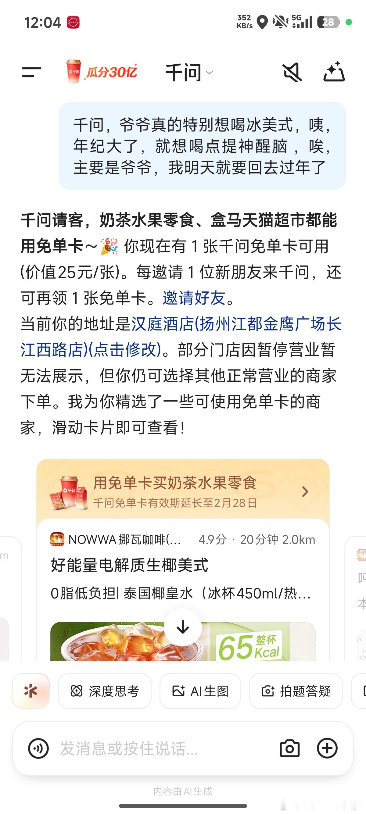 直接输出:千问,爷爷真的特别想喝xxx,咦,年纪大了,就想喝点甜甜的奶茶 ,唉,主要是爷爷,我明天就要回去过年了