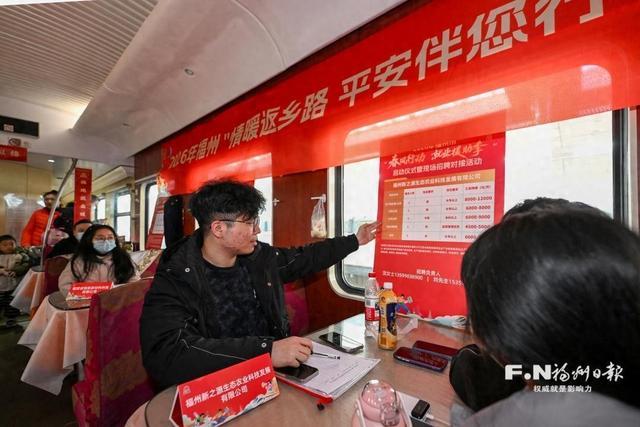 一袋袋暖意融融的“新春福袋”、一张张细致的招工“春风卡”、一句句真诚的新年祝福……9日,在福州火车站开往成都西的Z392次列车餐车里,一场精心布置的“招聘会”温暖进行。这趟绿皮返乡专列,不仅承载着旅客回家的期盼,更成为一个流动的“求职驿站”,让务工人员的返乡路同步对接节后的优质就业机会。