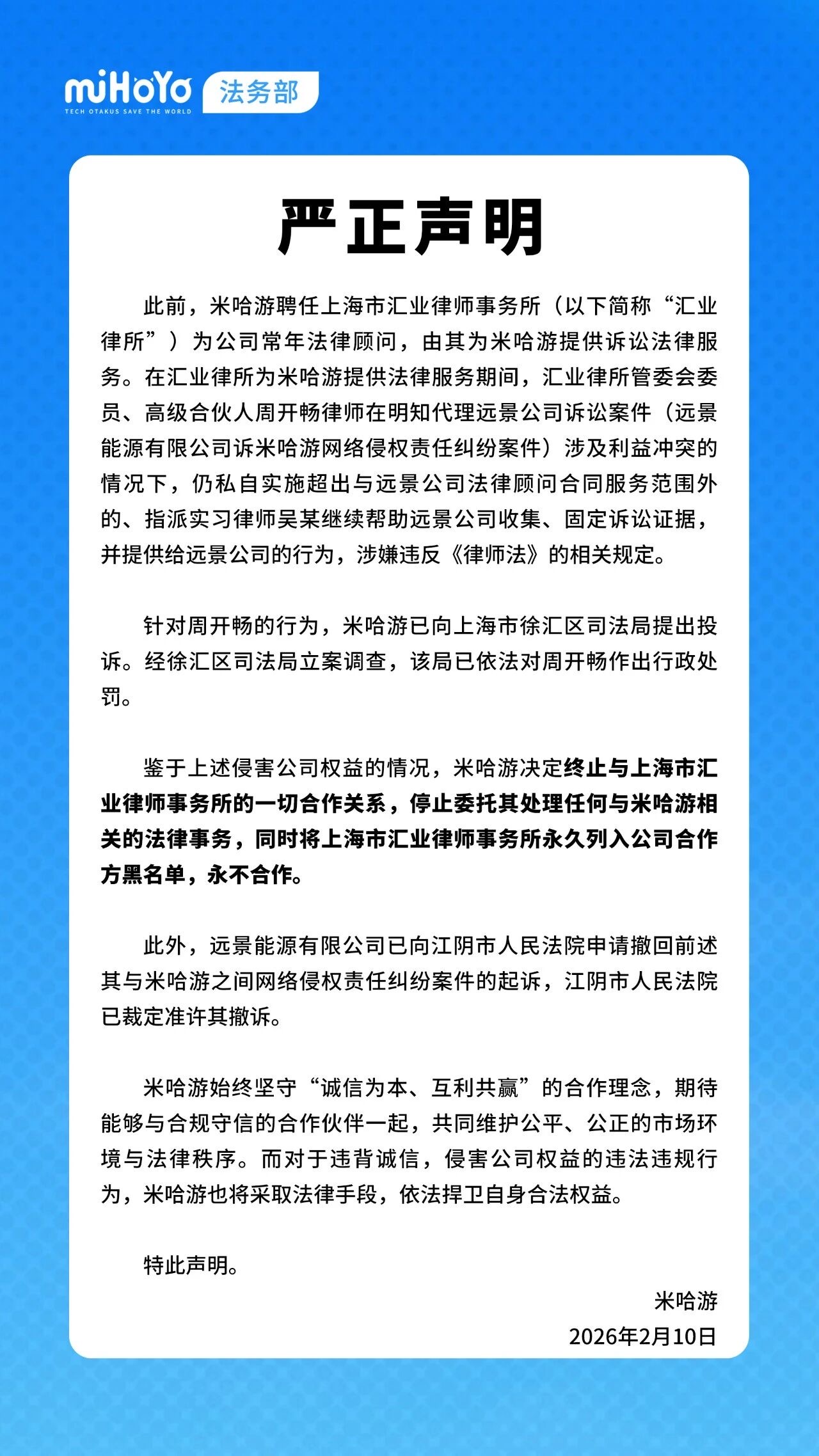 米哈游表示,鉴于上述侵害公司权益的情况,米哈游决定终止与上海市汇业律师事务所的一切合作关系,停止委托其处理任何与米哈游相关的法律事务,同时,将上海市汇业律师事务所永久列入公司合作方黑名单,永不合作。