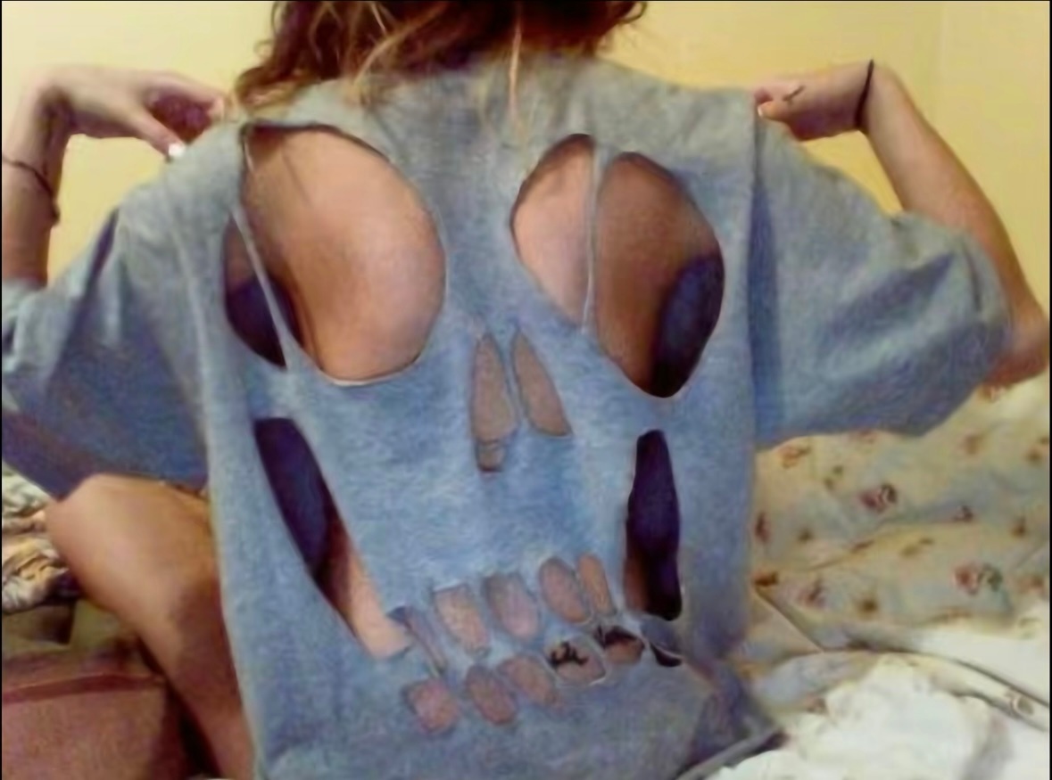 后背骷髅头镂空上衣diy 太美味了 这就回去把衣服剪了….