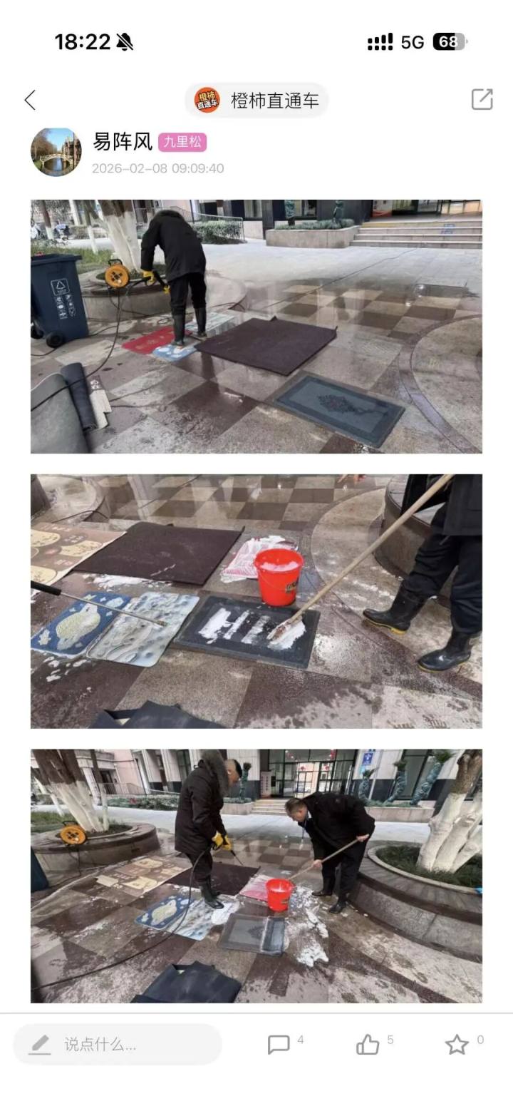 橙友“易阵风”住在凤起都市花园,物业为品尚物业,他在橙柿互动上发帖表扬:“居住的小区物业再次推出免费为居民清洗地垫服务。两名员工忙得不亦乐乎,你冲刷、我清洗,除去的是地垫上的污垢,增添的是居民对物业的赞许。这样的小区物业值得点赞。”