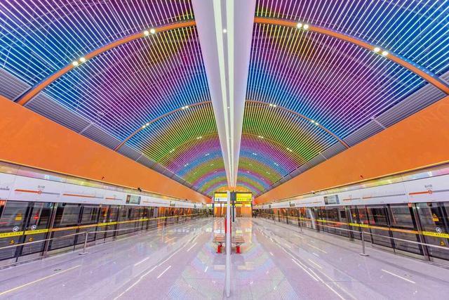 走进4号线西延伸段,全线站点延续4号线一期的装修风格,凸显线域文化。最具特色的嘉州路站,针对新牌坊片区用地紧张的情况,创新采用分离式端头厅设计方案,成为国内首座深埋暗挖分离式端头厅车站,这一设计使层高超7米的站台层空间无立柱,视觉更加宽敞,展现出站城融合、空间通透与绿色建造等特点。以橙色为主色调的站台搭配炫酷的灯光设计,高颜值将氛围感拉满,人行其中犹如穿梭于时光隧道。