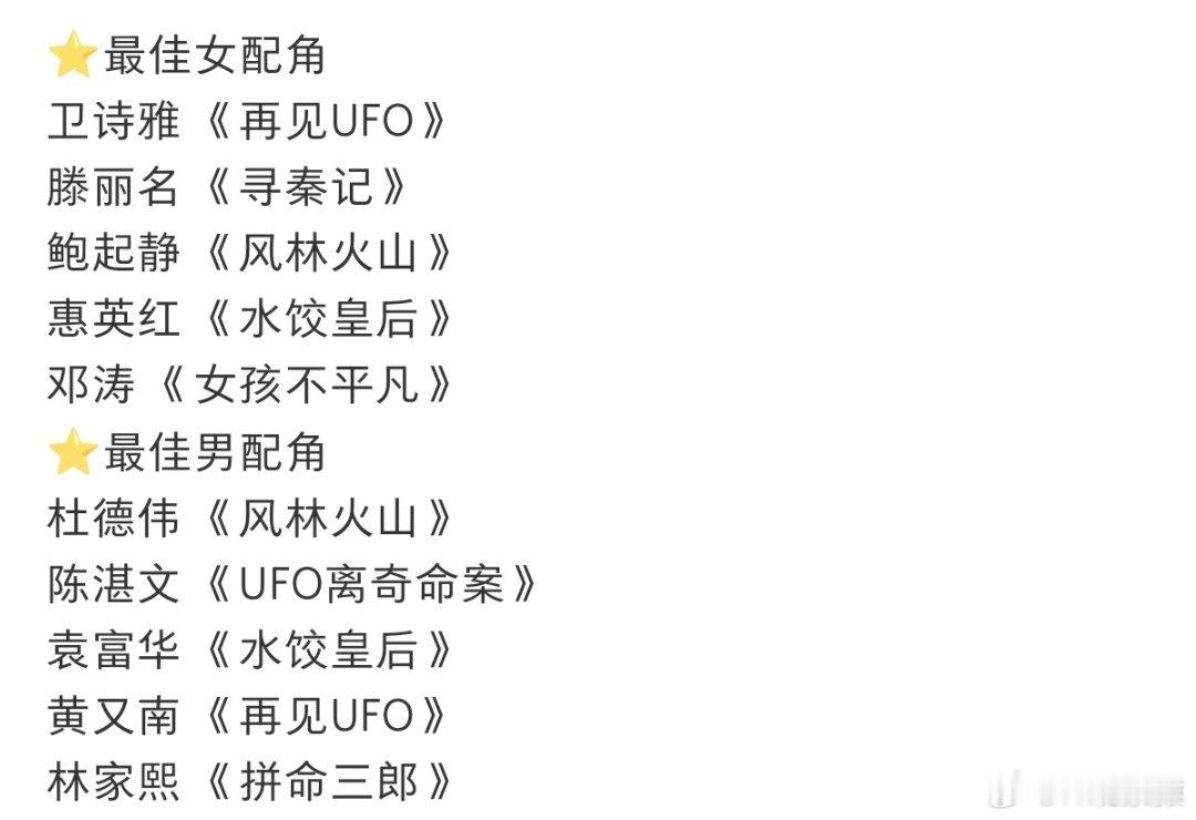 金像奖最佳男女主提名和男女配提名。