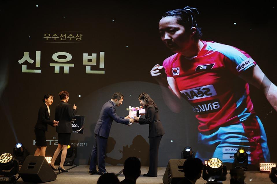 当天的颁奖典礼上,申裕斌还获得了优秀运动员奖,颁奖人为大韩乒乓球协会副会长金致焕。