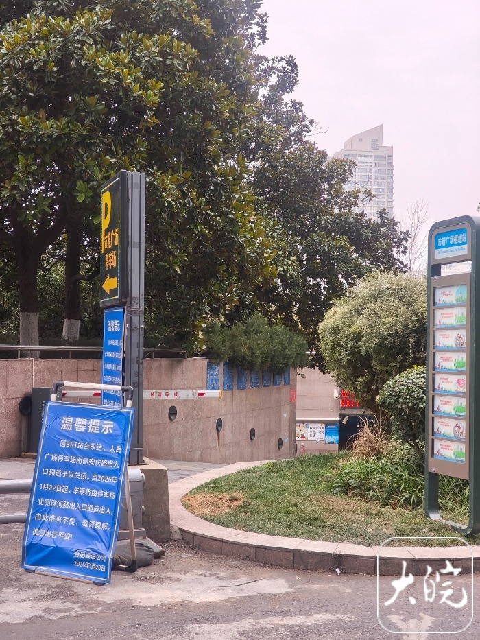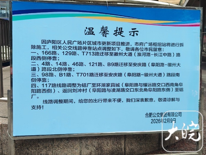 在现场,合肥公交集团有限公司已摆放两块温馨提示牌。提示牌内容显示,因庐阳区人民广场片区城市更新项目推进,市府广场枢纽站将进行拆除施工。