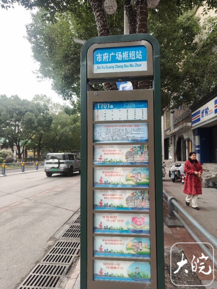 2月11日,枢纽站将整体搬迁至安庆路与徽州大道交叉口。随后,记者也步行前往以上路段,看到市府广场南侧的安庆路南、北两侧,以及徽州大道西侧路段,设置的9块新站牌已建设完成。