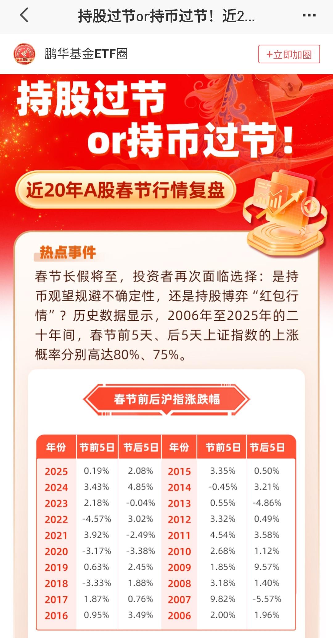 大红包最终还是没能等到,今日整个盘面着实让人提不起精神,波澜不惊地走出一条直线。影视、游戏、传媒板块争奇斗艳,而我的股票则静静停靠在岸边观望。 想起去年此时,因Deepseek的火爆,每日互动在春节前连拉三个涨停,家中的老股民劝我别卖,我还是在最后一个交易日选择了落袋为安,结果节后它又三个涨停。今年目前打算持股过年,毕竟当下手里的票都没怎么波动,节后慢牛行情应该会延续,值得期待!