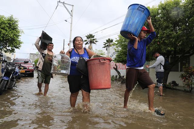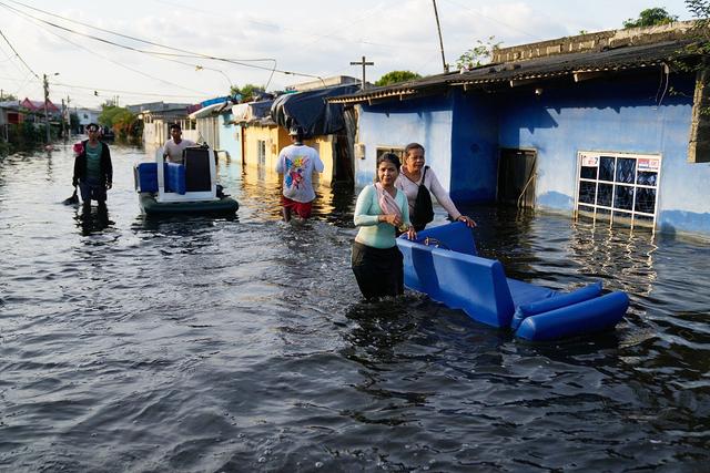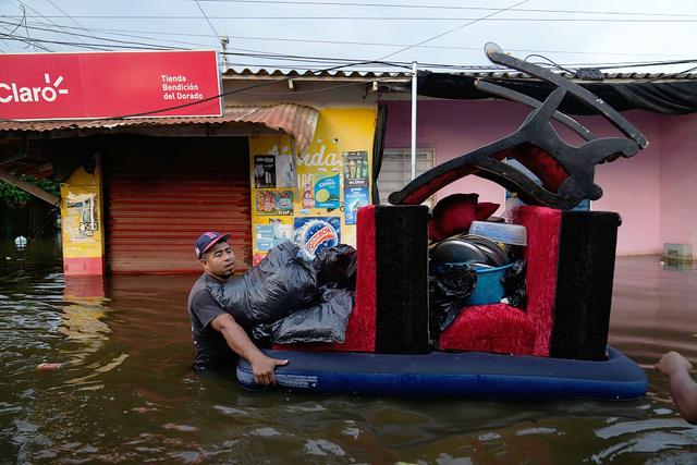 当地时间2026年2月7日,哥伦比亚蒙特里亚,锡努河再次涨水影响埃尔多拉多社区后,民众试图抢救财物。