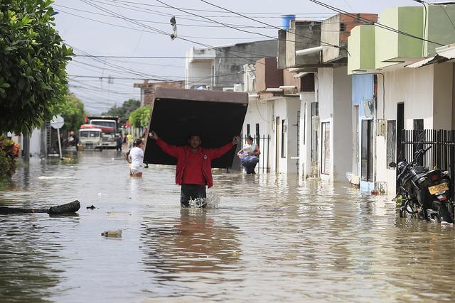 当地时间2026年2月9日,哥伦比亚蒙特里亚,民众在洪水淹没的街道上搬运物品。