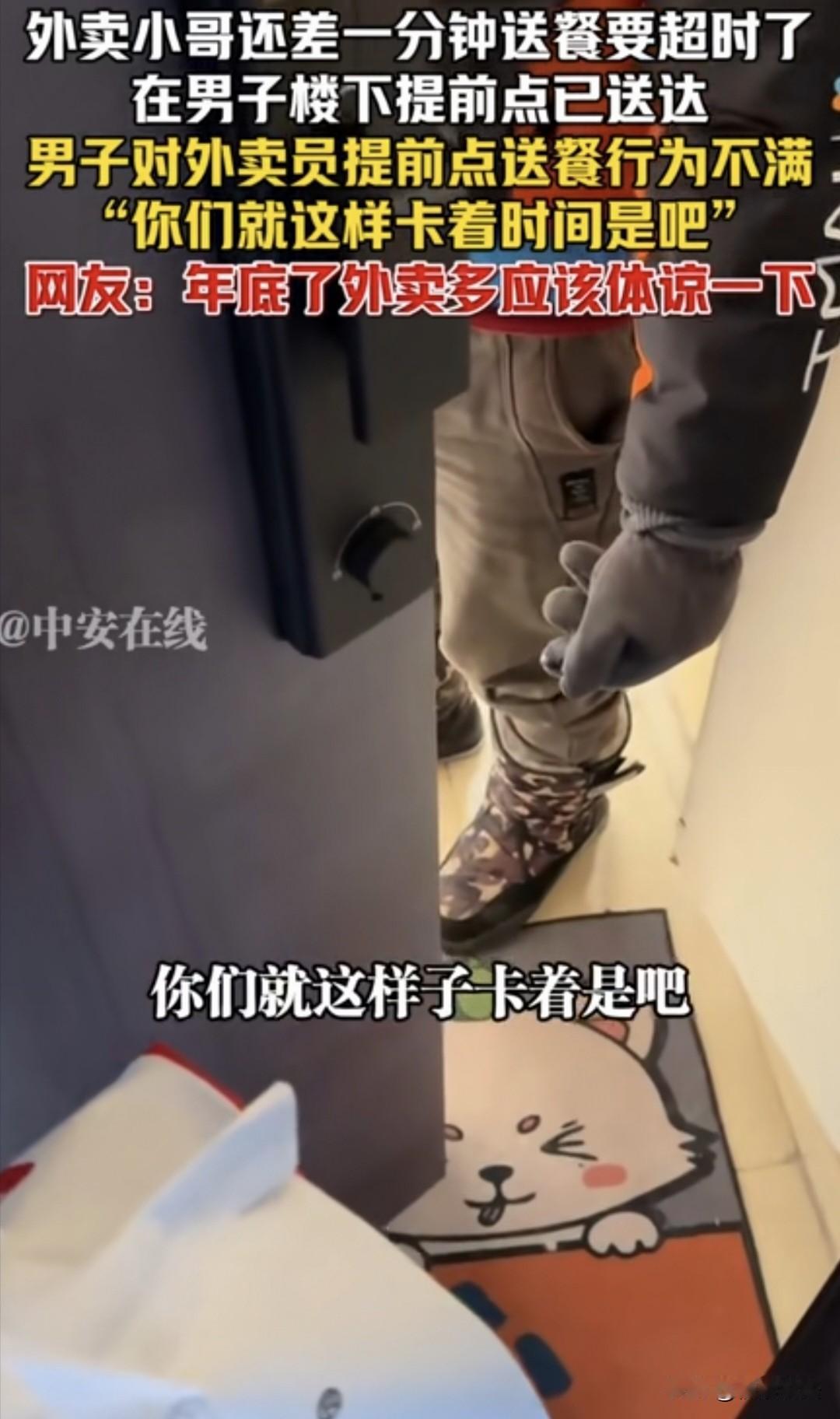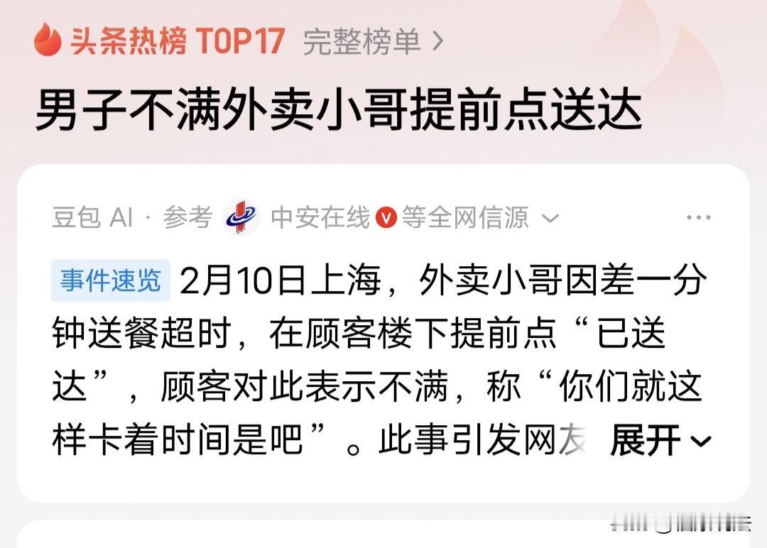 “该计较吗?”上海,外卖小哥送餐,在楼下发现还有1分钟就要超时,便提前点了已送达,不料,顾客不高兴地问:你在楼下就点送达了?小哥有些不好意思的说:对,差一分钟就超时了。顾客冷漠的说:你就这样卡着时间,是吧?随后,顾客把这事发网上,网友:年底了,多点理解,有点格局吧! 2月10号,一位外卖小哥,正风风火火地穿梭在城市的大街小巷,他心里头啊,就惦记着一件事——赶紧把餐送到顾客手里。 外卖小哥最担心的就是千万别超时了,毕竟超时那可是要扣钱的,这一单说不定就白跑啦,真是“分分皆辛苦”呐! 小哥好不容易到了顾客住的小区楼下,瞅了瞅手机,哎呀,不好!距离订单规定的送达时间就差那么一分钟了,这要是再上楼,万一在电梯里卡一下,或者顾客开门慢一点,那可就妥妥超时了。 小哥心里非常着急,为了不超时,先在楼下把订单状态点成了“已送达”,想着等会儿跟顾客好好解释解释,说不定能得到理解呢。 接着,小哥拎着外卖,噔噔噔地就上了楼。到了顾客家门口,他抬手敲门,“咚咚咚” 不一会儿,门开了,一个男子探出头来。 小哥将外卖递进来,还没等开口,男子就皱着眉头问:“你刚送达吧?你在楼下的时候就点送达了?” 小哥有点不好意思,挠挠头,笑着说:“对呀,还差一分钟就超时了。” 男子听了,沉默了一会儿,语气中明显透露出不满,嘟囔着:“你们就这样卡着时间,是吧?” 小哥一听,赶紧收起笑容,一脸诚恳地回答:“啊”。 其实,外卖小哥也不容易啊,要是超时了,这一单就白跑了。但他看到男子的态度,也没有过多解释。 但男子听了,语气里还是带着气,说:“行,我知道了。”然后把门“砰”地一关,留下小哥在门口一脸无奈。 这事儿一传到网上,可就像炸了锅一样,网友们那是议论纷纷,各执一词。 有一部分网友觉得,外卖小哥风里来雨里去的,每天忙得脚不沾地,就为了多挣点钱养家糊口,大家应该多体谅体谅他们。 有人说,我从来不盯着看时间,更从来不催促,因为能尽快送达没人愿意拖拉时间,点了外卖你等着送到就行,更何况人家在楼下点了送达,马上就送上来了,一分钟对自己没啥,但是对骑手小哥来说是钱。 天呐,这1分钟至于吗?1分钟不吃是要饿死了吗?虽然我点了外卖,但不太关注送达时间,但要是看到送达时间快到了,外卖员还没到的话,我还会提醒他,你可以先点送达。谁也不会故意给你晚送,晚吃一点也不会饿死。 可另一部分网友就不这么想了,他们觉得,既然接了单,就得按照规定的时间把餐送到,这是外卖员的本职工作。 因此,有人说,其实我觉得顾客没错啊,他用钱购买的是平台承诺在约定的时间内送达约定的商品啊,如果是我,看到外卖员这样的答复和态度,我一定投诉到底! 这不是较真,尤其外卖配送时间够用,他们会选择同时接很多单,到时候你吃的东西已经凉了,别说菜,饭都凉了,根本没法吃。快递也是,很多第一天配送,他自己签到,然后第二天还没到,耽误很多事! 最客观的看法是,我们应该提谅小哥的辛苦,但不能把这种体谅当作“理所应当”。 对于顾客来说,宽容是情分,投诉是本分,这两种选择都值得尊重。 从法律角度来说,外卖服务合同中,“准时送达”是核心契约条款。 《民法典》第509条规定,当事人应当按照约定全面履行自己的义务。 骑手提前点击“已送达”属于虚构履行事实,构成违约。 虽然一分钟微不足道,但法律维护的是契约的严肃性。 如果准时率可以随意注水,平台规则将形同虚设,消费者的知情权和公平交易权也会受损。 真正该反思的是平台的算法,能不能给骑手留出几分钟的“合理宽限”?别总让两个同样不容易的普通人,在门口为了那一分钟红脸、斗气。 但大多数网友还是觉得都不容易,差一分钟,别计较,多体谅一下,多一点理解,格局打开吧。对此你怎么看呢?
