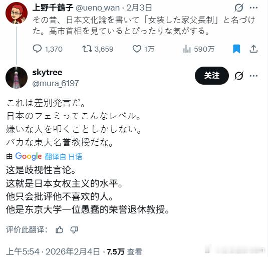🔻上野千鹤子对高市开炮了🔻暗示她是穿着女装的父权制维护者。🔻评论区的日本人