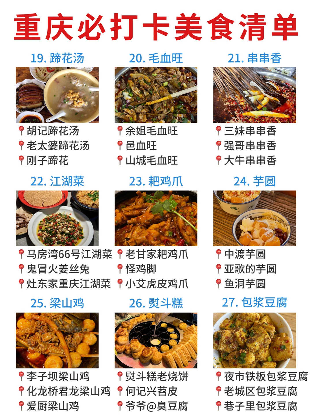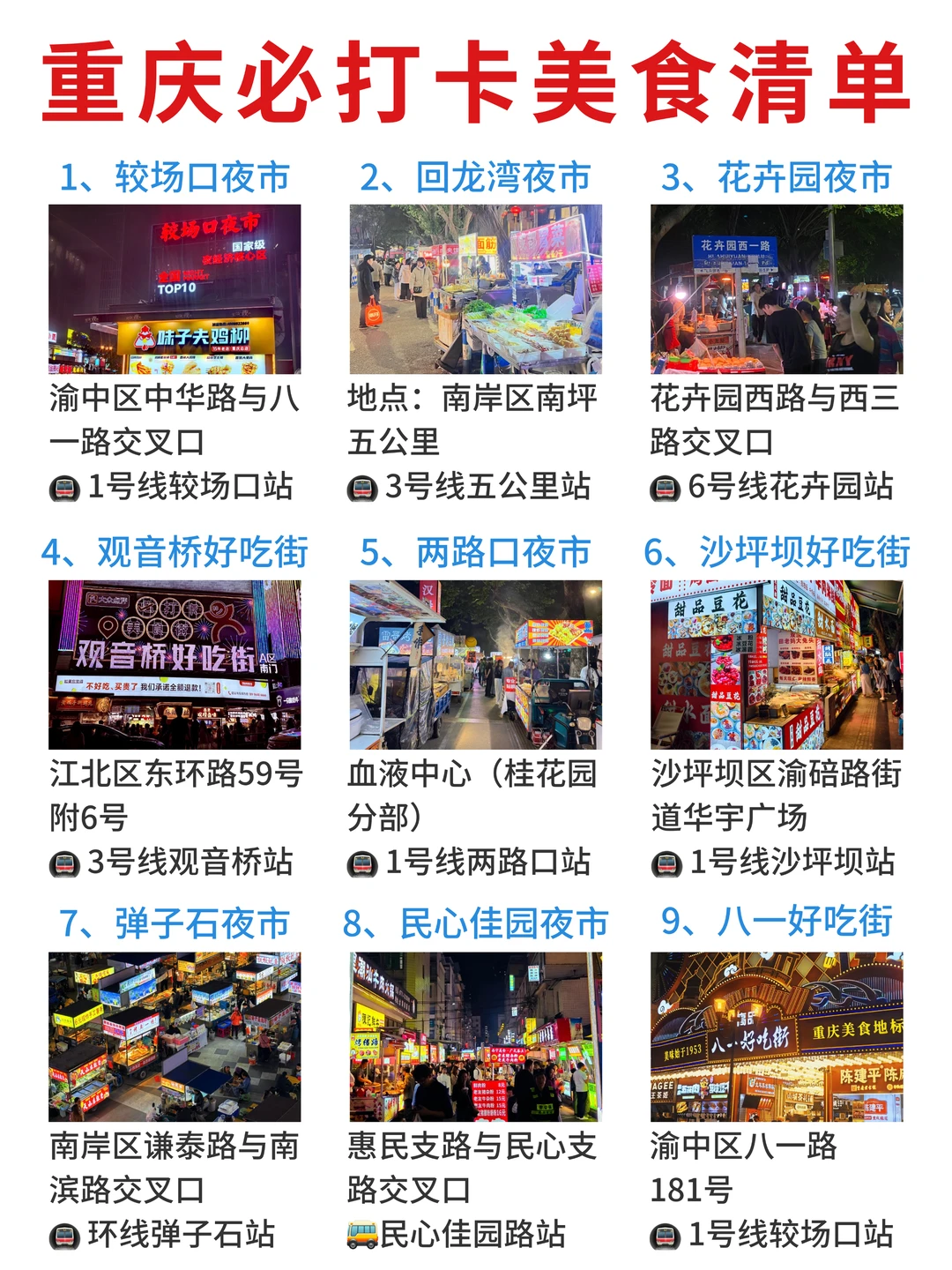 📍八一好吃街 📍观音桥好吃街 📍沙坪坝好吃街 📍弹子石夜市 📍民心佳园夜市 📍回龙湾夜市📍花卉园夜市 📍较场口夜市 📍两路口夜市