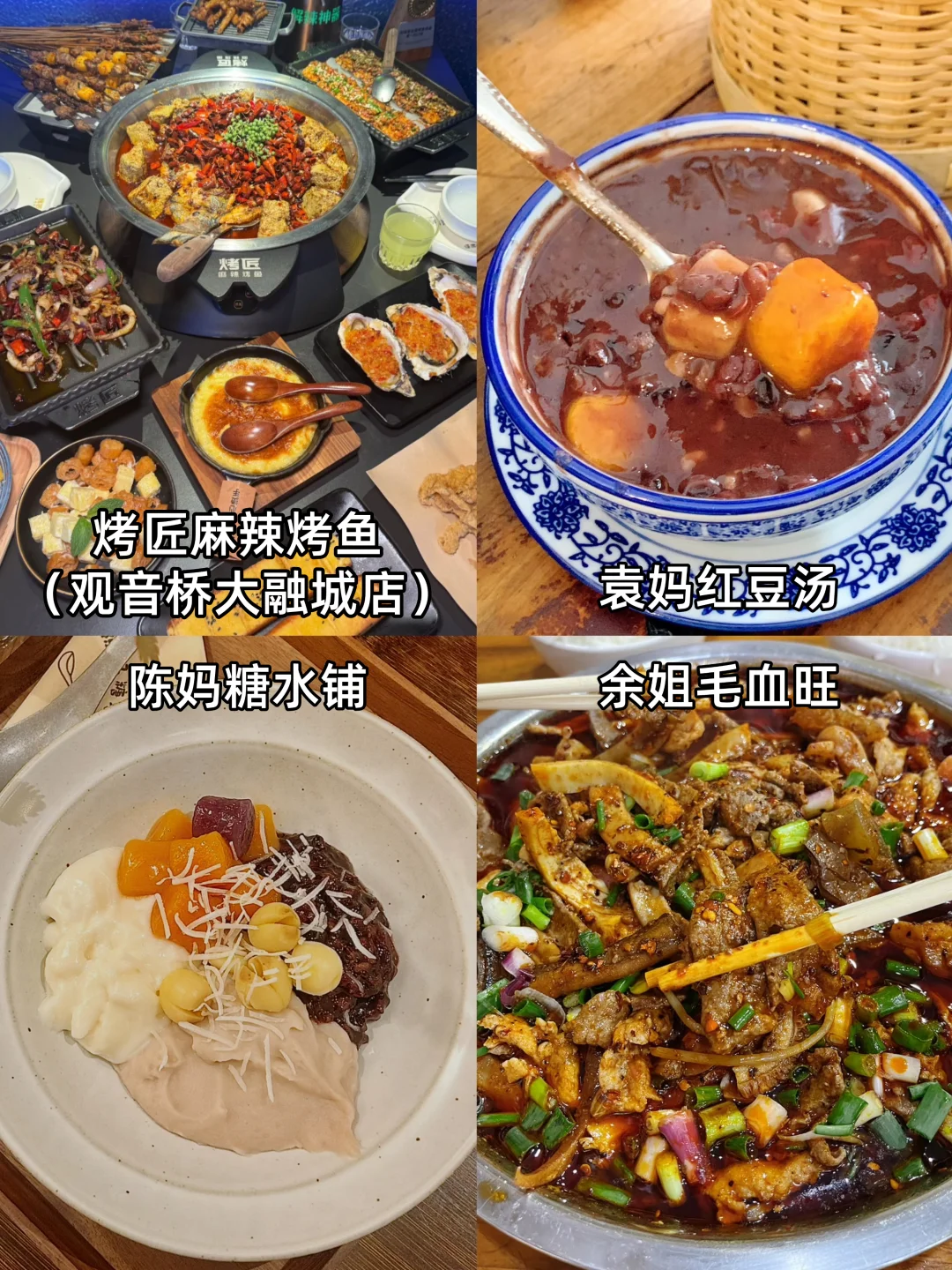 ✔️渝味晓宇火锅 ✔️烤匠麻辣烤鱼(观音桥大融城店) ✔️余姐毛血旺 ✔️三妹串串香 ✔️马房湾66号江湖菜 ✔️老甘家耙鸡爪 ✔️中渡芋圆