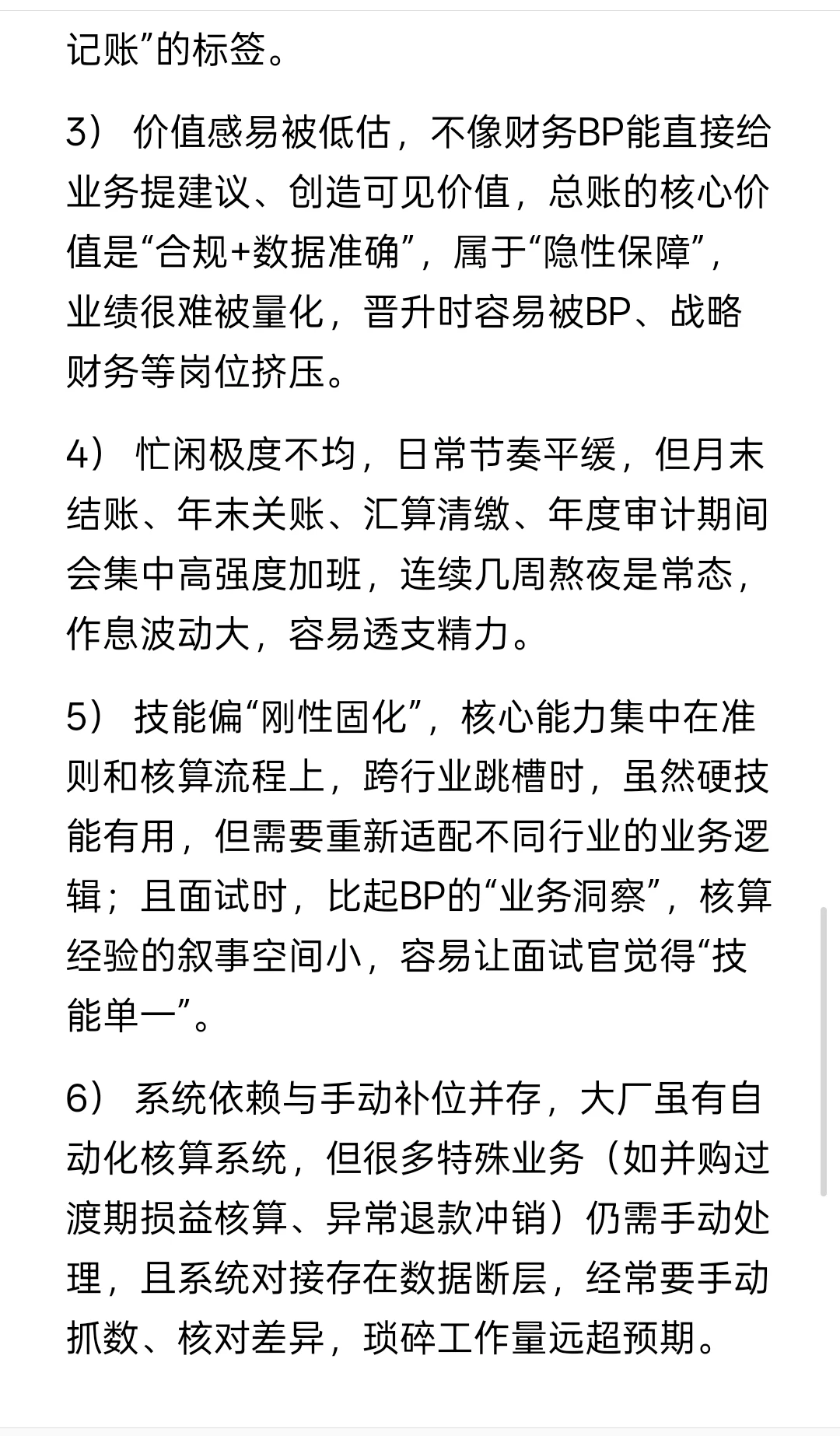 3) 价值感易被低估,不像财务BP能直接给业务提建议、创造可见价值,总账的核心价值是“合规+数据准确”,属于“隐性保障”,业绩很难被量化,晋升时容易被BP、战略财务等岗位挤压。
