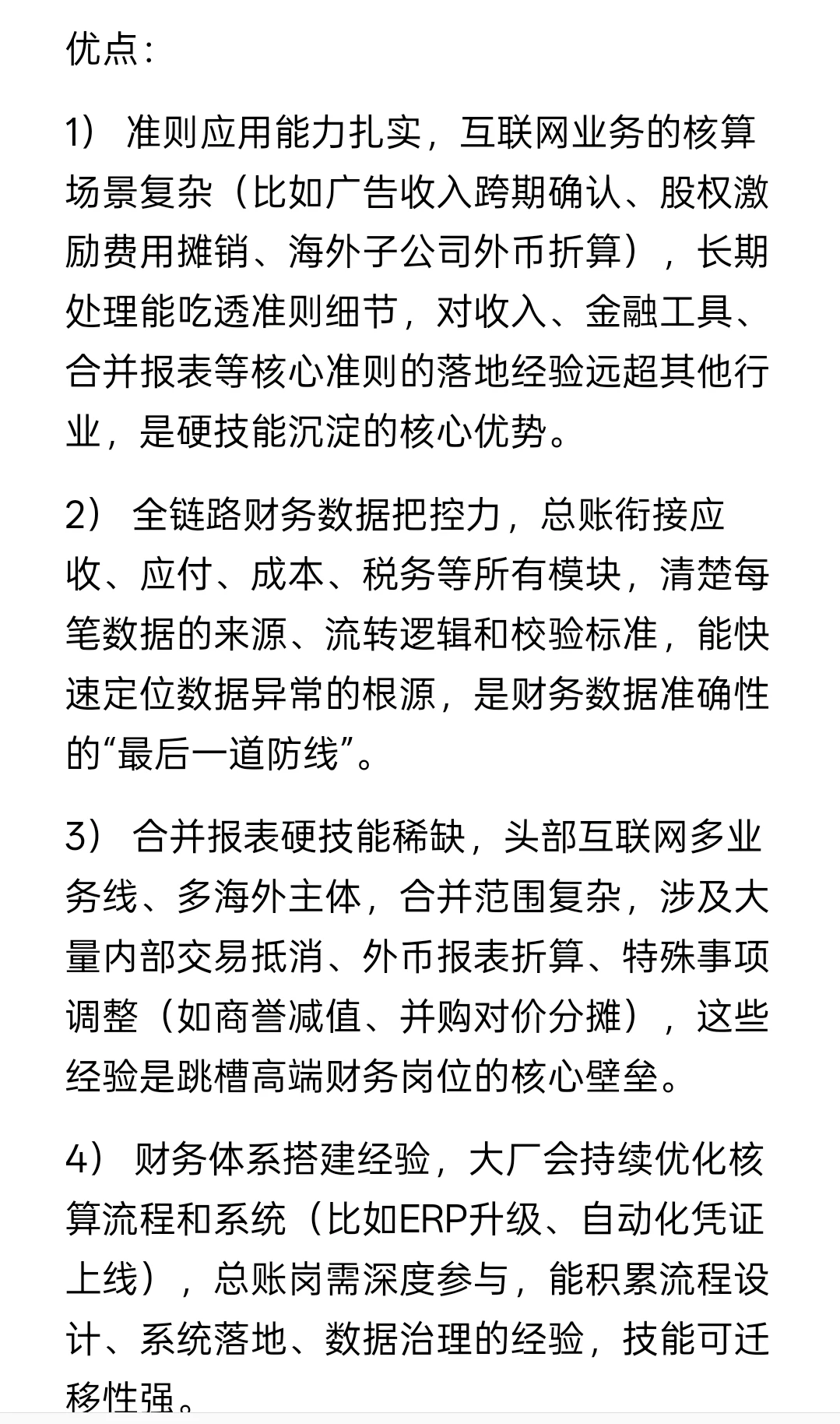 4) 财务体系搭建经验,大厂会持续优化核算流程和系统(比如ERP升级、自动化凭证上线),总账岗需深度参与,能积累流程设计、系统落地、数据治理的经验,技能可迁移性强。