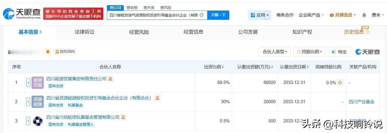 【四川能源集团等成立油气资源股权投资引导基金 出资额10亿】 天眼查App显示,近日,四川省能发油气资源股权投资引导基金合伙企业(有限合伙)成立,执行事务合伙人为四川省川投航信私募基金管理有限公司,出资额10亿人民币,经营范围为创业投资,由四川能源发展集团有限责任公司、四川省资源能源股权投资引导基金合伙企业(有限合伙)、四川省川投航信私募基金管理有限公司共同出资。 天眼查信息:
