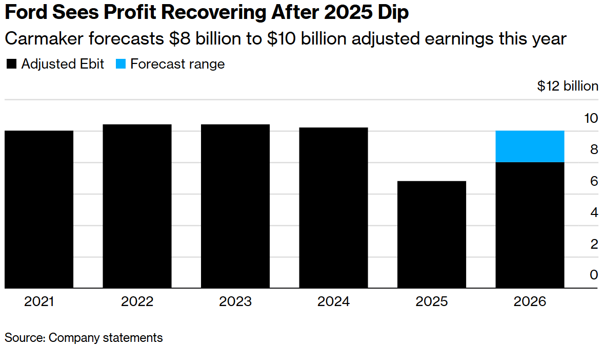福特汽车预计,在去年年底承受了一笔意外的关税账单后,2026年的利润将实现大幅增长。四季度调整后的息税前利润(EBIT)为10亿美元。