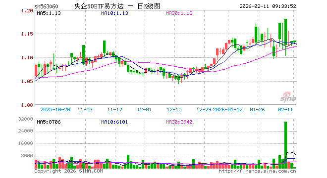 2月11日,央企50ETF易方达(563060)开盘涨0.44%,报1.135元。央企50ETF易方达(563060)重仓股方面,长江电力开盘涨0.04%,中国船舶跌0.14%,中国神华涨0.45%,中国石油涨0.09%,海康威视跌0.15%,中国建筑涨0.00%,中国电信涨0.00%,中国铝业跌0.68%,中远海控涨0.21%,中国中免跌0.68%。