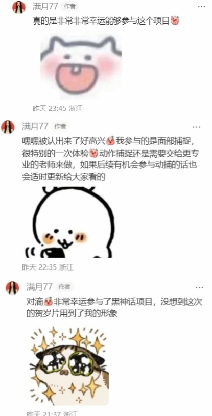 满月77在回应中写道,“嘿嘿被认出来了好高兴,我参与的是面部捕捉,很特别的一次体验。动作捕捉还是需要交给更专业的老师来做,如果后续有机会参与动捕的话也会适时更新给大家看的。”同时对游戏科学团队表达了感谢,称能参与“黑神话”项目感到“非常非常幸运”,并坦言没想到这次贺岁短片会直接使用自己的形象。