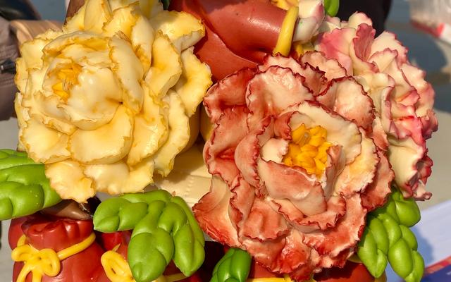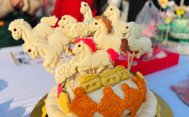 比赛现场,黄冬梅带来十多款新作,以红薯粉、红曲米粉、南瓜粉等天然食材调色,制作出色彩艳丽、形态逼真的牡丹花束、花篮与“牡丹花山”,传统花枣馍搭配鲜花造型,寓意日子蒸蒸日上、岁岁安康。马年主题作品更是亮点纷呈,多匹骏马立于多层花馍之上,搭配鲜艳花卉,“马背福来”“马到成功”的美好祝愿跃然“馍”上。