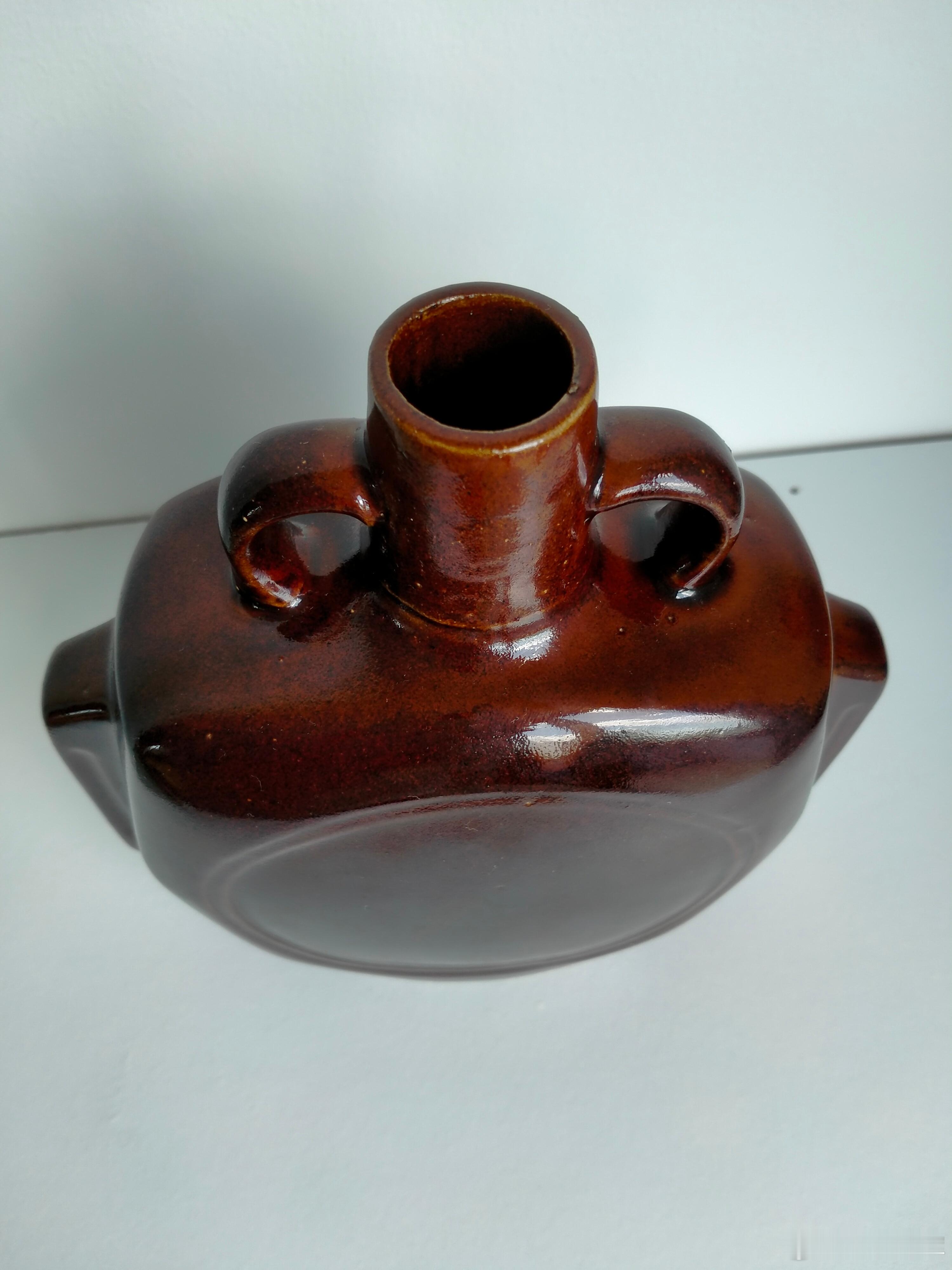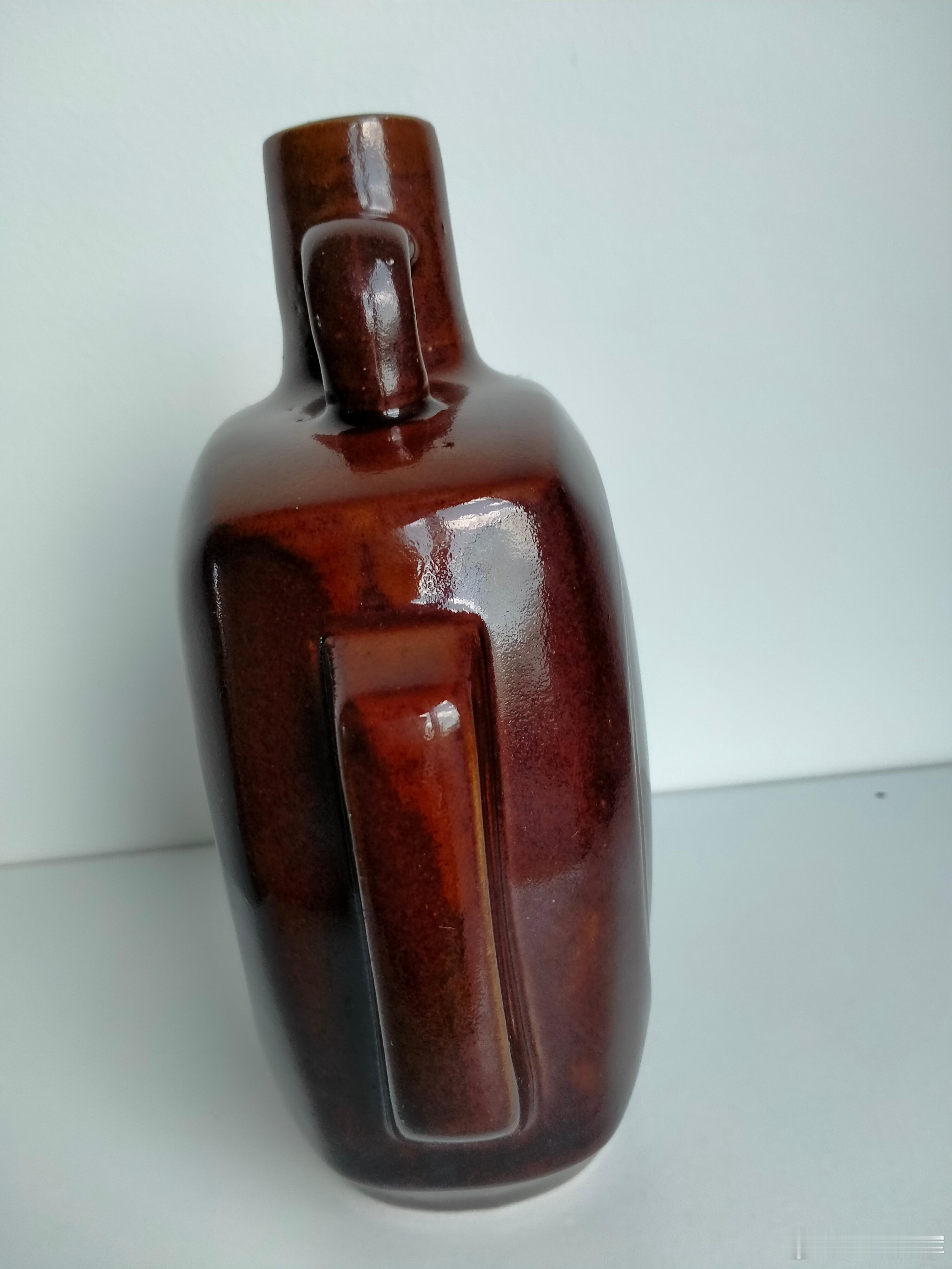 每周鉴赏收藏精品之北宋磁州窑酱釉扁瓶 从文化底蕴方面看,如果是宋金时期的,我们可以称其为扁瓶或者扁壶。主要是西夏王朝等马背民族使用。有两种主要器型,一种是容量大的,一种是可随身携带的。本件酱釉扁瓶就是后一种。从路份上说,可随身携带的要高档一点。 如果是元末明初的,就叫做抱月瓶了。虽然是酒瓶子,但现在属于高档器型,当陈设器对待了。并且是存世稀少的品种。不过,明代的抱月瓶,以器身为圆形的为主;而宋金时期的,以器身为方,中间开圆窗为主,如本件和最后一个图片的巩县窑。其实也可以叫抱月瓶吧? 本件酱釉扁瓶的器型特点,除了方形器身中有圆形开窗外,器身两边各有一个出戟。出戟瓷器在北宋时期的高端瓷器中有出现。除了美感的因素之外,手拿的时候也可以多一个握的力点,没有特别大的实用价值。收藏的一条理念就是没有实用的器件比实用件要贵重。 说到磁州窑,可能最容易想到的就是白地黑刻花或酱釉刻花。其实,本件纯酱釉扁瓶,实际上对窑工的烧造技艺要求更高。因为所有瑕疵无处可避,无处可逃。 宋金及以前的单色釉瓷器,除了看釉色外,如古玉般的釉光也是美感的焦点。像本件酱釉扁瓶,宝光四溢。本身就是时代的印证。