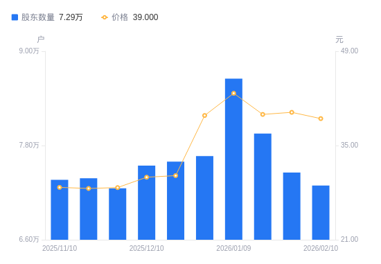 日期A股户数(户)流通A股户均持股数(股)户均持股市值(万元)2026-02-107290011267.6843.942026-01-307456611015.9343.992026-01-207953110328.2340.922026-01-09865119494.9140.602025-12-317664910716.5742.292025-12-197595010815.2033.022025-12-107544110888.1732.982025-11-287254911322.2032.552025-11-207382711126.2031.842025-11-107363311155.5232.11