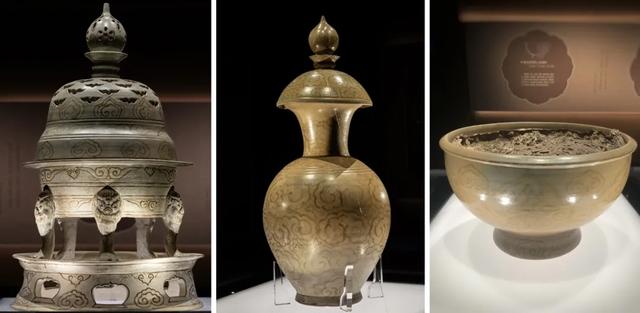 三件“镇馆之宝”一定不要错过:秘色瓷褐彩云纹油灯、秘色瓷褐彩云纹盖罂、秘色瓷褐彩云纹熏炉(下图左一,堪称晚唐秘色彩绘瓷的巅峰之作),均为吴越国王钱镠生母水丘氏墓出土。