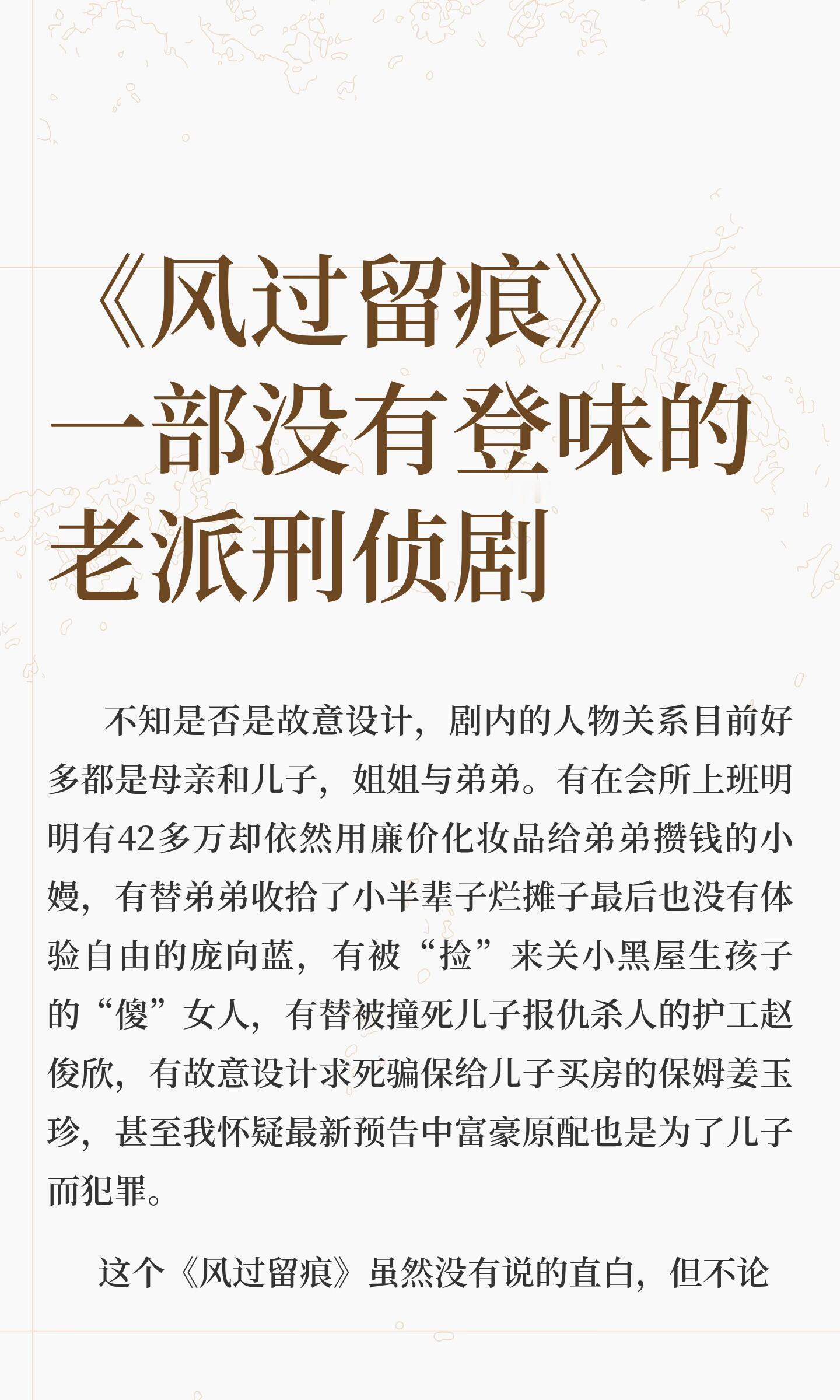 《风过留痕》一部没有登味的老派刑侦剧网友说的这点也是我看这剧觉得最舒服的地方,是一部很符合逻辑真实又严谨的“警察故事”风过留痕